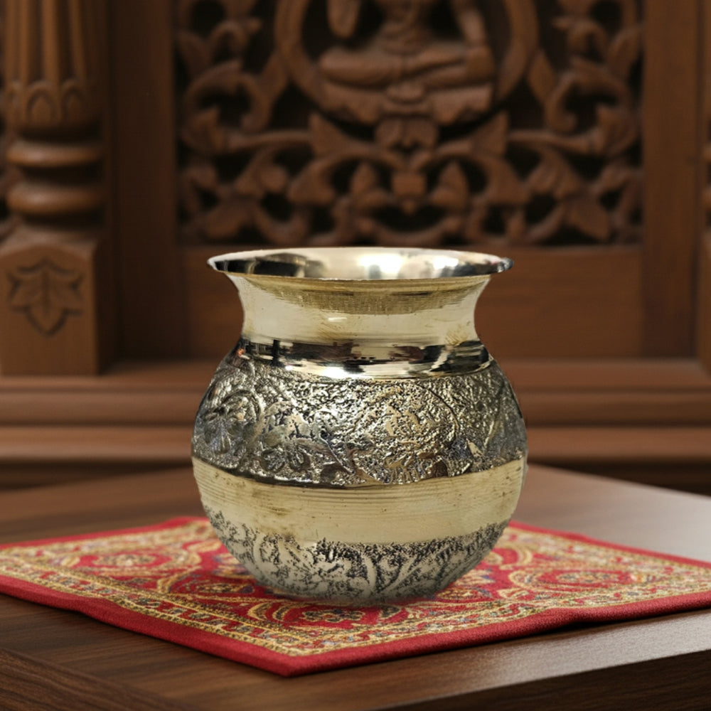 This brass pooja kalash has a sturdy round belly and a flared rim that holds water, flowers, mango leaves, and a small coconut with ease. The slim neck rises in smooth curves and gives each shape clear balance. The heavy base keeps the kalash steady on any altar or shelf. The polished surface reflects lamp glow and invites focus into every ritual. There are simple grooves around the neck and a bead line near the rim that add gentle detail. The weight feels balanced, and the kalash stays firm when filled or carried. Cleaning is easy with a soft cloth, and the solid brass build promises lasting quality. Use this pooja kalash in daily puja, festival ceremonies, or meditation rituals, and welcome purity, abundance, and calm devotion into your home.