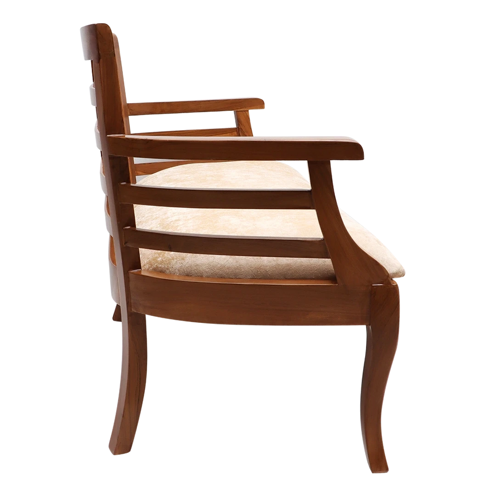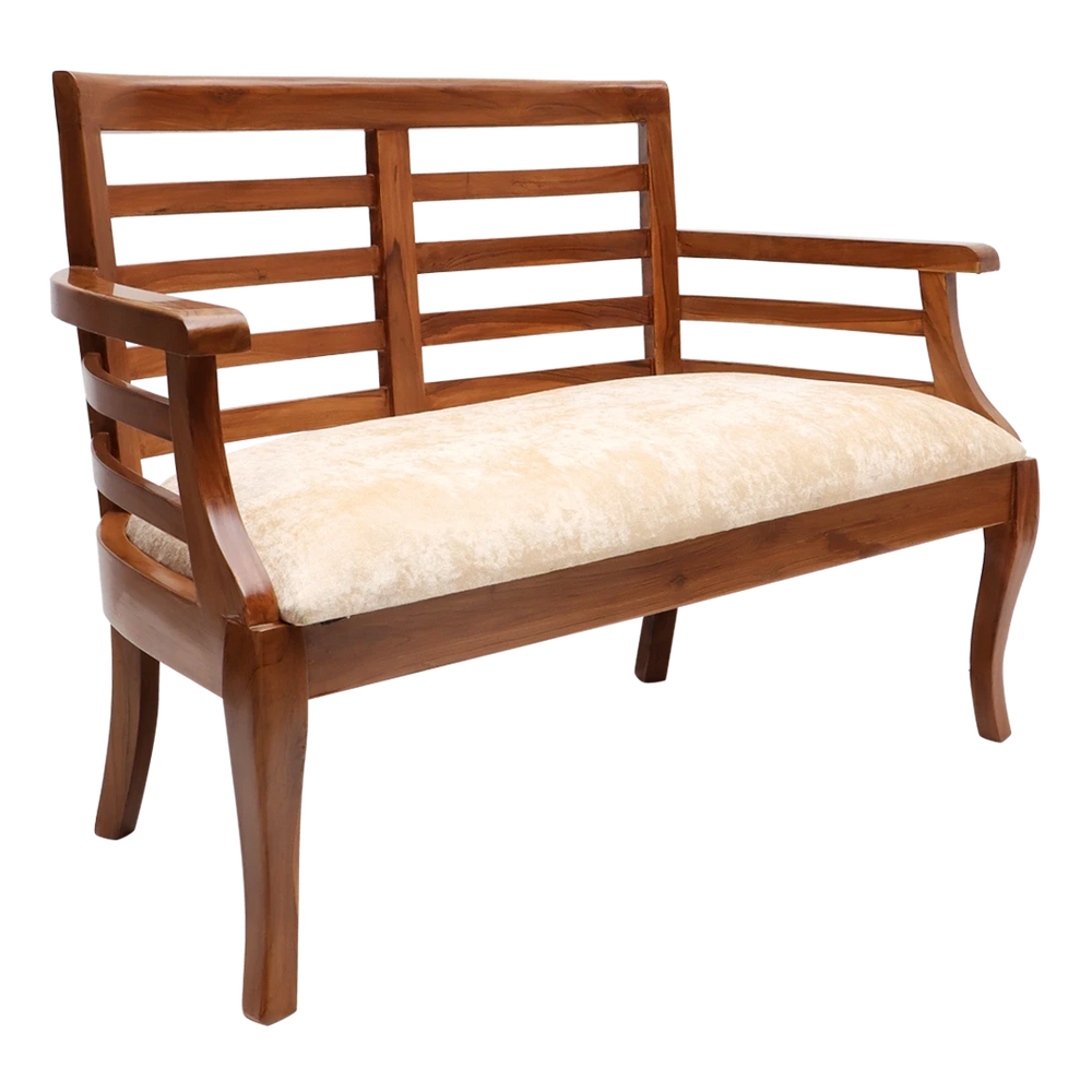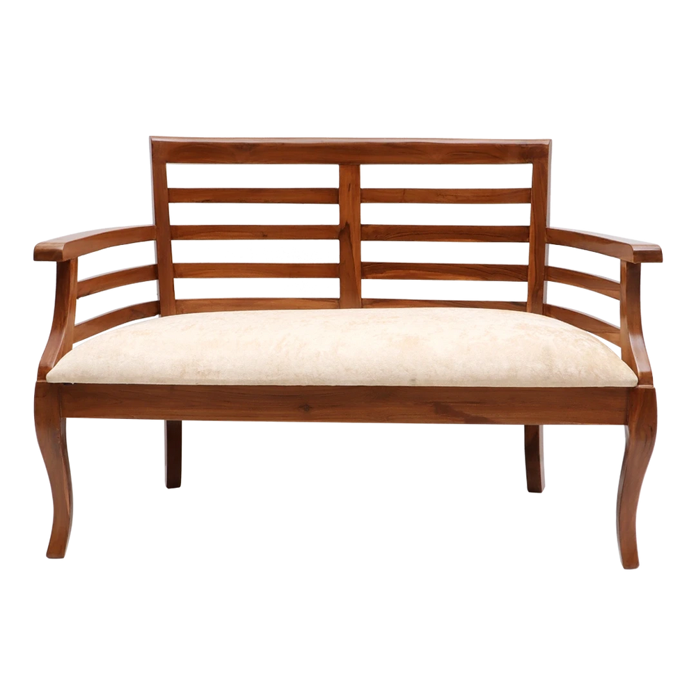 The Carile Solid Wood Love Sofa is a mix of comfort and style in a simple and modern shape. Made as a compact 2 seater wooden chair, it has a wide frame with slatted sides and backrest that give support and a neat look. The soft beige seat cushion looks nice with the teak color wood and matches many types of room styles. The armrests are flat and easy to rest your arms on. The back and legs have a gentle curve that gives the chair a smooth and graceful shape. You can keep this 2 seater chair in a bedroom, hallway, or reading corner and it will add both comfort and beauty to the space. The frame is strong and made for daily use. The design is simple but has nice details in both the wood and fabric. The teak color wood shows natural grain lines and the soft fabric makes the chair feel cozy. This love seat is light in look but strong in use — a good choice if you want something simple and strong.