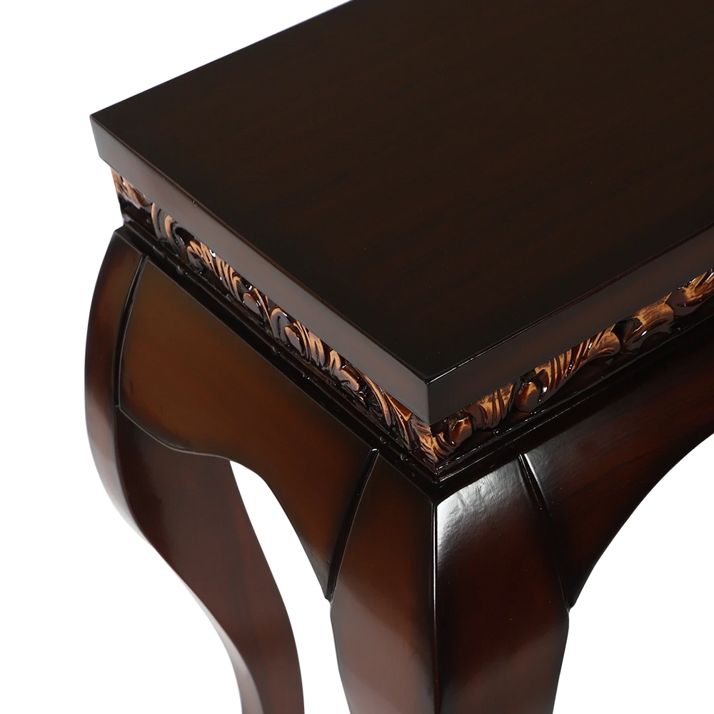 The Cazalu Solid Wood Console Table is a gorgeous combination of beautiful style and functionality that will elevate your home's décor. This table features curves and intricate edge detailing and brings sophistication to any room. It matches both modern and classic concepts with its deep brown finish. This table is made from solid wood, which makes it durable, and the solid construction provides a reliable and sturdy piece of furniture. Its smooth surface provides ample space to display your decorative items or just to place daily items. This is the perfect console table for living room or any other room. With its sleek and minimalist design, it enhances the ambiance of any space without being overwhelming. The table's low-maintenance surface ensures that it will continue to look beautiful over time with just easy maintenance. For your house, the Cazalu Console Table offers the ideal combination of design, usability, and solid construction.