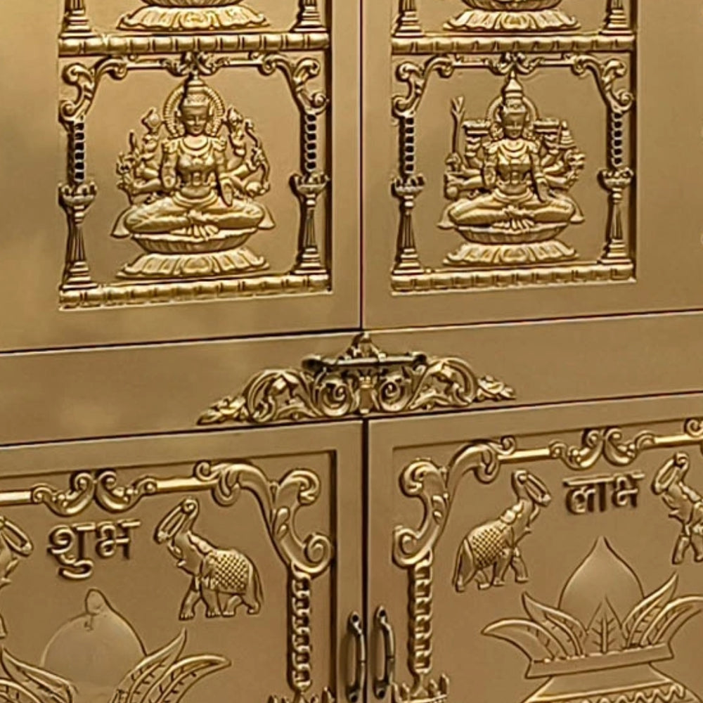 The top decorative set adds the finishing touch to this mandap. It includes sculpted figures placed above the doors which give height and temple-like detail to the structure. These figures are also arranged in a manner that creates balance and symmetry to the overall design. The details are sharp and clear that make them stand against the plain background. The details are sharp and clear that make them stand against the plain background. This feature draws attention to the upper part of the mandap and makes the large temple look taller. The gold color surface gives the set a glowing finish that blends with the rest of the pooja mandap. The placement of figures adds temple identity to the design. It makes the mandap look complete and well structured.