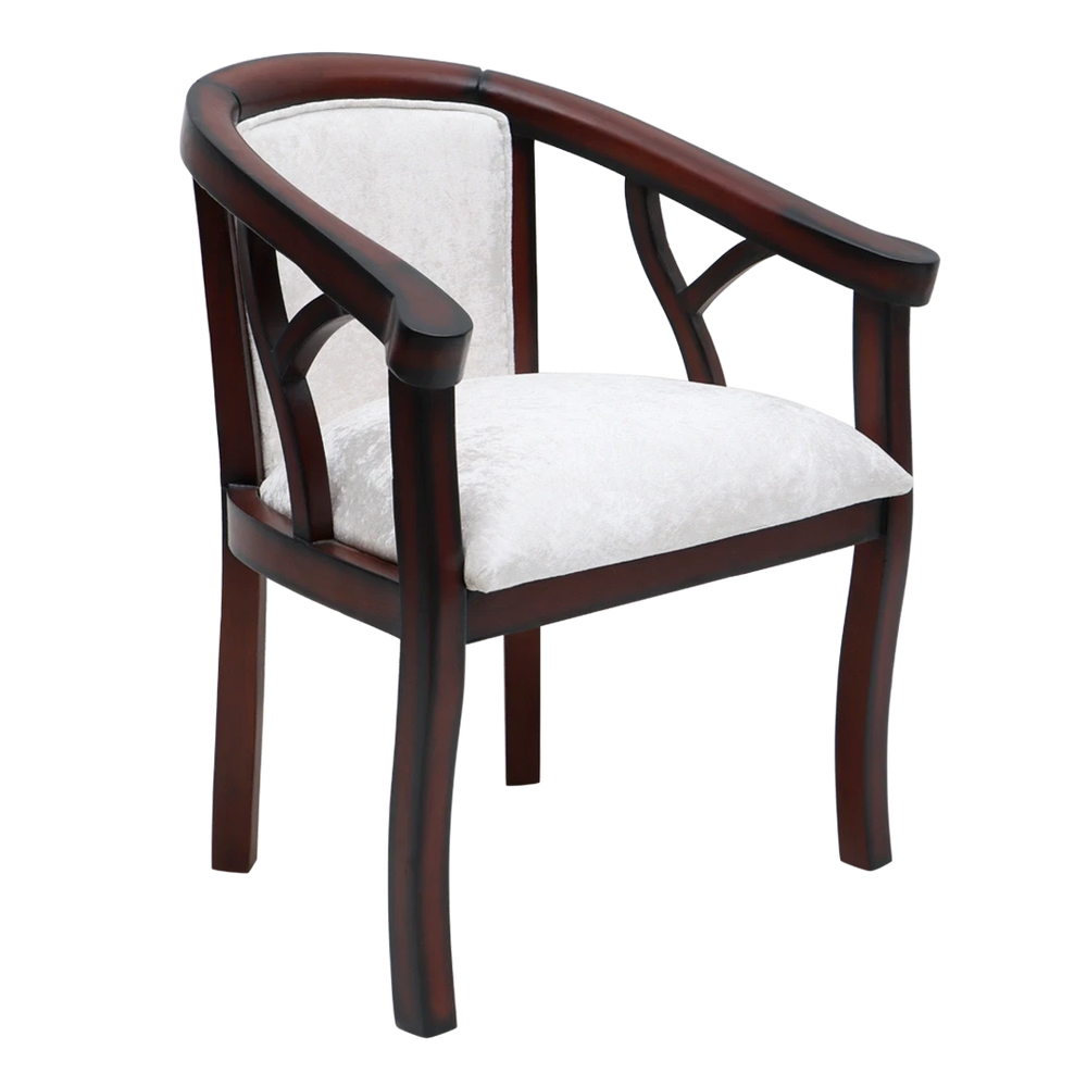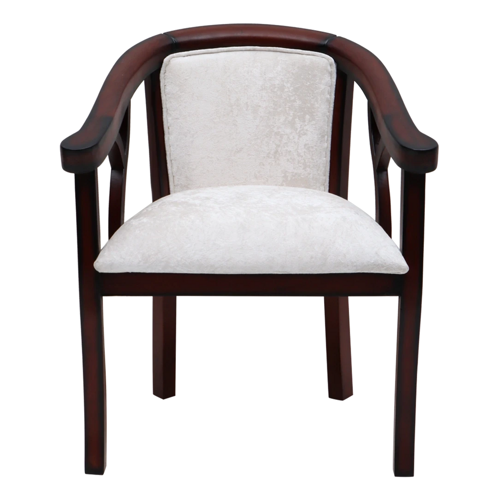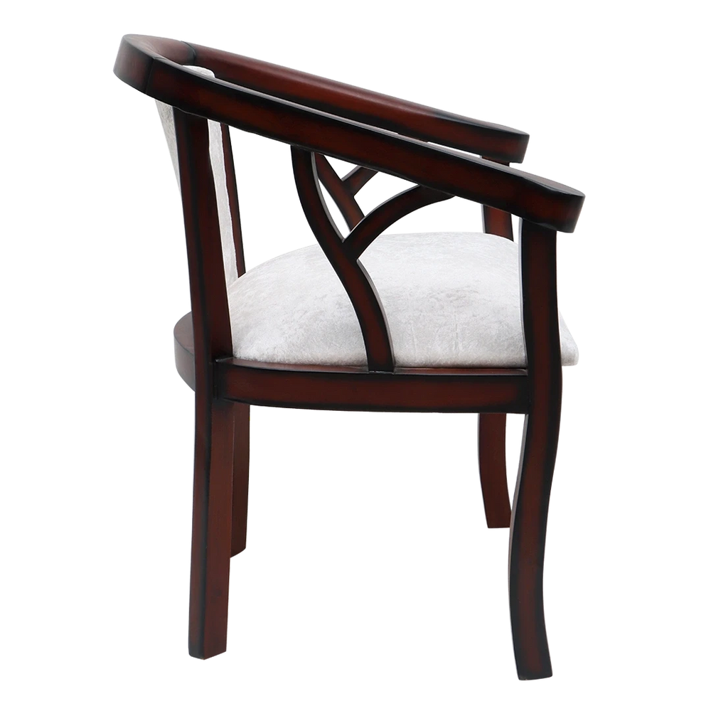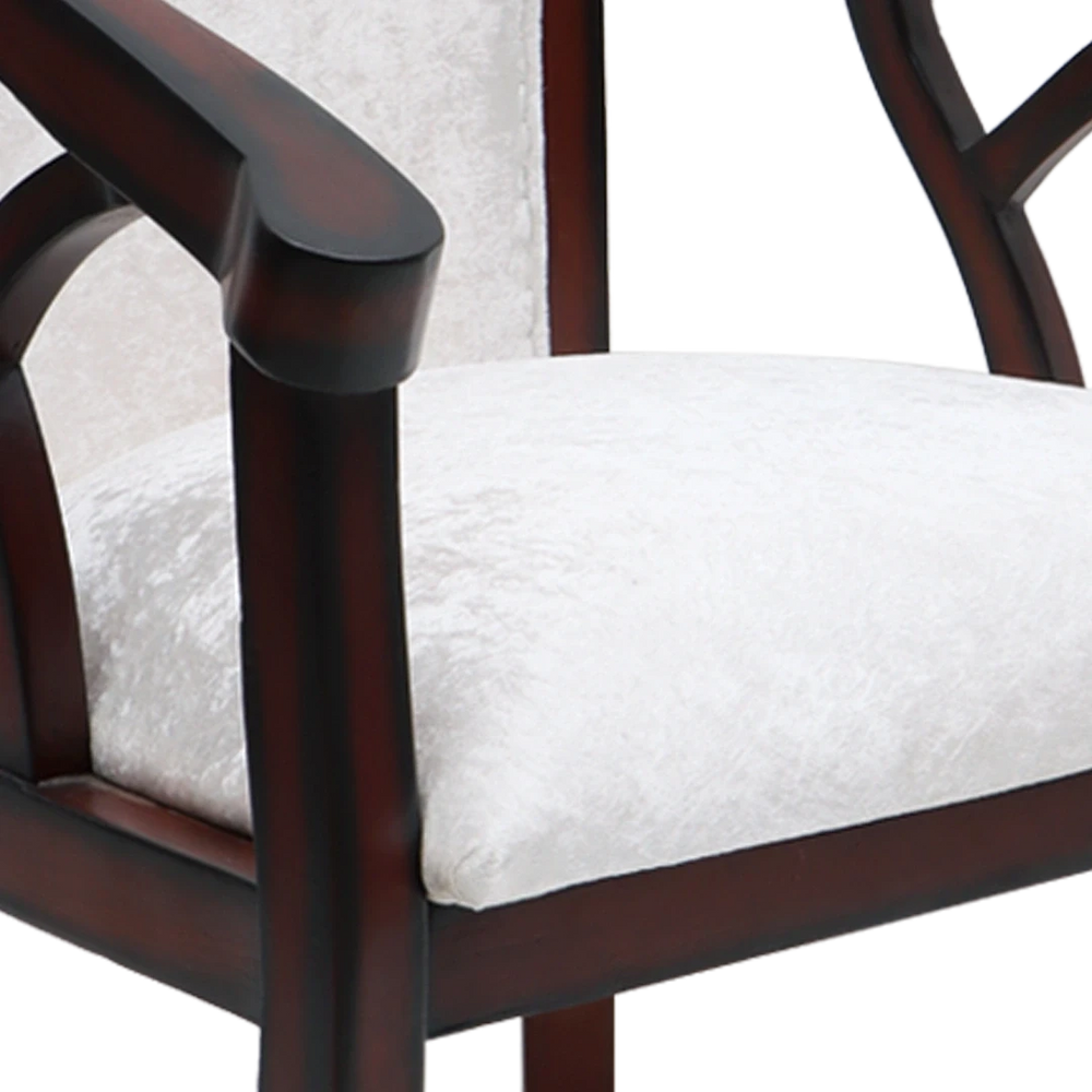 This armchair showcases the timeless appeal of the teak wood that is combined with the modern upholstery. The smooth and curved armrests and sleek wooden legs highlight the expert craftsmanship that ensures the chair remains a focal point in any room. The soft Upholstered fabric complements the rich wooden backseat. The versatile rich brownClassic Design with Modern Comfort color of the armchair with soft cream color silver fabric cushion blends in any kind of home decor. The glossy finish enhances the overall aesthetic appeal of the wooden wooden chair. The cushion has been properly attached to the chair and this gives the chair a perfectly clean look from both the front and back.