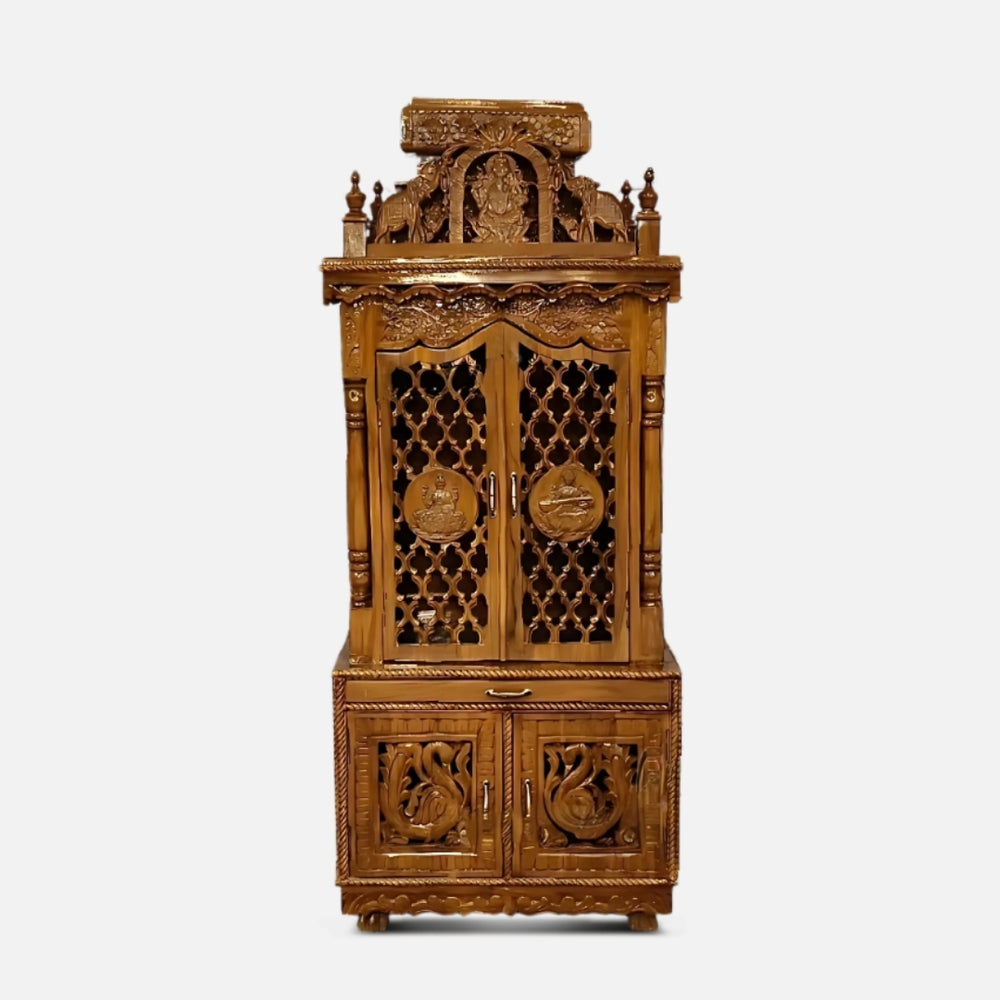 The Deepashri teak wood mandap with door in teak color is crafted with attention to detail, featuring traditional carvings and a tall frame that reflects temple-style architecture. This big pooja mandir offers ample space for idols and creates a serene atmosphere for daily rituals. It has been designed in the form of a pooja mandap that is both attractive and sturdy enough to be used by a family aspiring to have both an appearance and a purpose. The lower part is stable, and the carved decoration is applied to the upper part to make it more decorative. This large wooden temple is of teak color and it feels warm and beautifully elegant to be added in your sacred area. Whether placed in a large room or dedicated prayer area, this large temple brings a sense of divinity and charm into the home. Every aspect of its design is made to add grace and presence, offering a devotional centerpiece that elevates spiritual practice while blending seamlessly with traditional interiors.