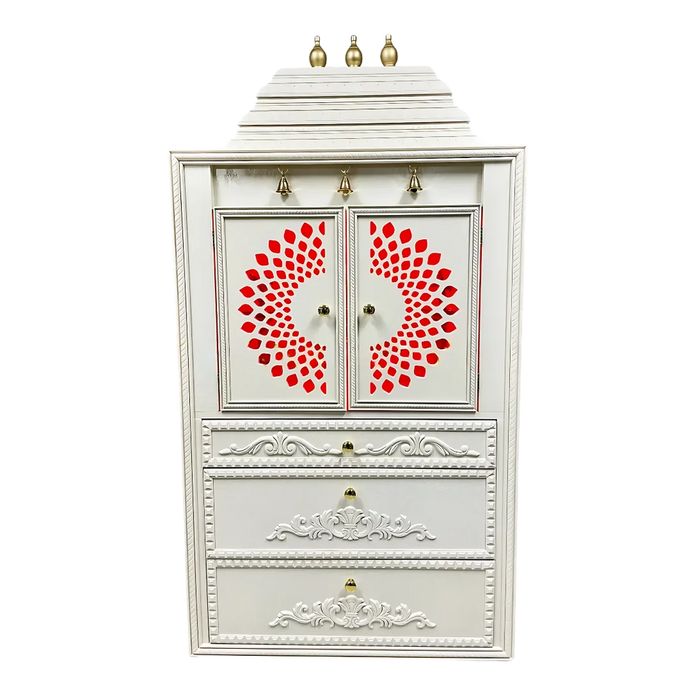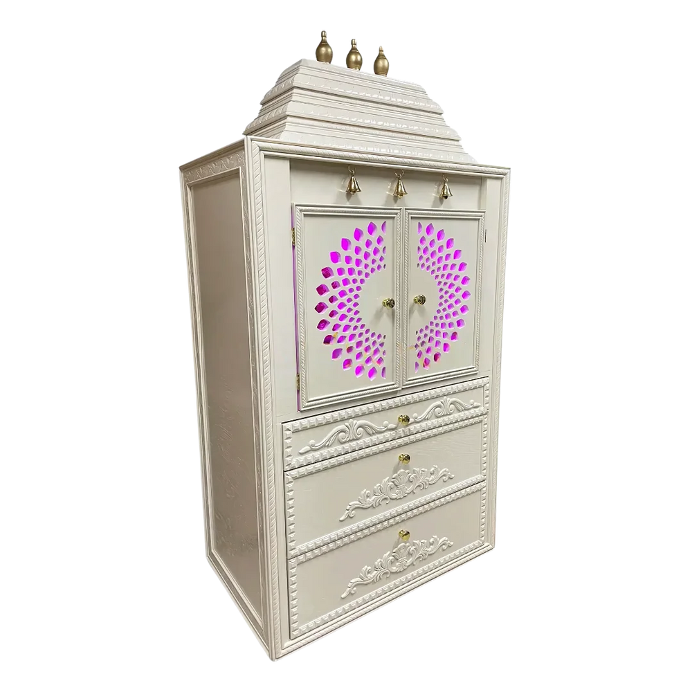 The Devashala Teak Wood Mandap White With Door is designed as a big size wooden temple that adds devotion and charm to any Indian home. This pooja mandap comes in white color which gives a very peaceful and clean feel to your space. It has a wide base and strong structure which gives it a solid look. The design on the doors and drawers makes this pooja mandap more graceful. This is a big mandir for home which allows you to keep many idols inside. The white color blends well with any wall color and makes the space brighter. The LED inside the mandap looks good and highlights the idols placed inside. This teakwood pooja mandap is suitable for those who want a temple that is beautiful and functional. The storage drawers are helpful for keeping pooja samagri safe. The full body of the mandap is crafted carefully and the small details on the outer part give it a royal finish. The white color of this mandap makes it easy to match with modern or traditional decor. This mandap is perfect for everyday worship at home.