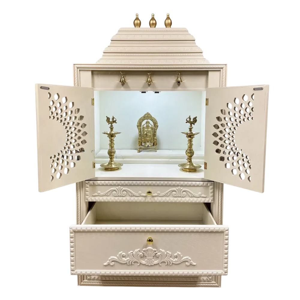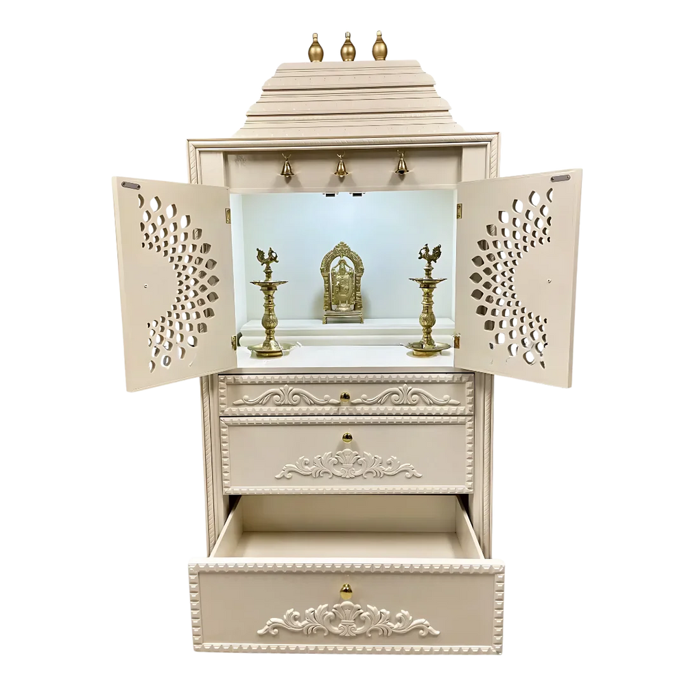 The mandap comes with big drawers that help store pooja items like incense, diya, and religious books. These drawers slide smoothly and can hold many things. Each drawer has a strong handle for easy use. The carved design on the drawer face gives a rich look. The white color finish on drawers keeps the pooja area looking clean. All three drawers are equally deep and useful. The structure remains strong even after daily use. The design matches the upper temple perfectly. It saves you from buying extra storage for pooja things. This feature keeps the setup tidy and organized.