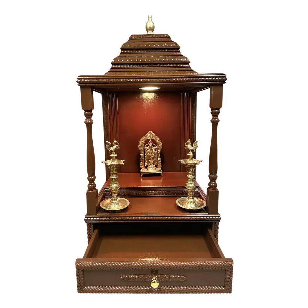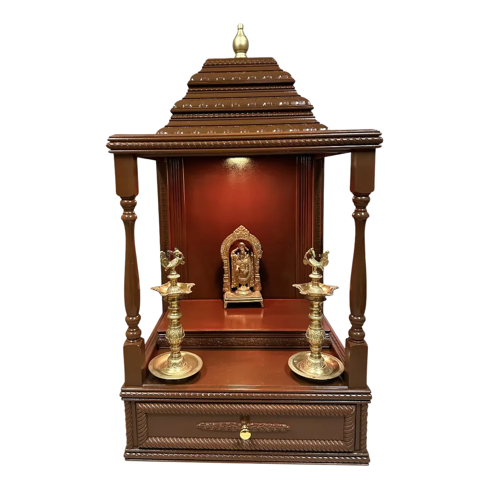 Bring home a devotional touch with the Devashraya Teak Wood Mandir, crafted in a rich brown color. Designed to reflect traditional Indian values, this wooden temple is ideal for daily rituals and spiritual moments. Its open structure features two carved pillars supporting the top frame, while the stepped dome on top adds height and elegance. The warm brown finish blends beautifully with most interior themes and highlights its craftsmanship. The spacious prayer area comfortably accommodates idols and decorative items, illuminated by a focused overhead light that enhances the sanctity. A large drawer at the bottom offers practical storage for pooja essentials, keeping your home temple tidy and organized. Whether placed in your living room or a dedicated corner, this pooja mandir stands out as a graceful symbol of faith. Its compact yet bold profile makes it a fitting mandir for home settings where aesthetics and utility matter. With smooth contours and a clean silhouette, the Devashraya mandir is an excellent choice for anyone seeking a durable, spiritual wooden temple with timeless appeal.