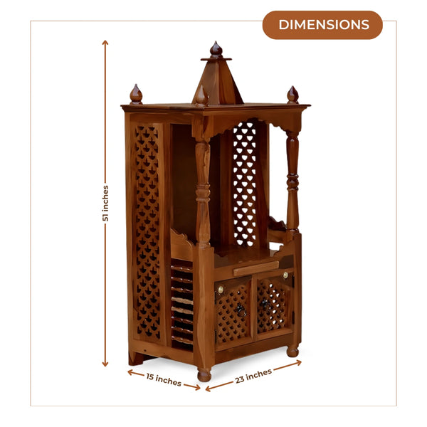 This Devrekha Teak Wood Mandir in teak color has a traditional temple design which looks rich in any prayer area. The top section has a pointed dome with four side finials which gives good height to the structure and improves the look of the space. The front frame has a wave cut arch shape which looks elegant and highlights the idol space. The pillars on both sides have smooth turning work and the natural grains of teak color look clear and classic. The side and front doors have jaali patterns with carved shapes which allow air and light to pass through softly. The lower part has a spacious storage area with shutter doors and round knobs which open easily to store pooja items safely. The base platform stays firm and flat which keeps idols steady without movement. A small railing on the sides gives a safe boundary to the platform. The mandir stands on rounded legs which keep the structure strong and balanced. The surface has a natural shine which keeps the mandir looking premium every day and adds peace to the home.