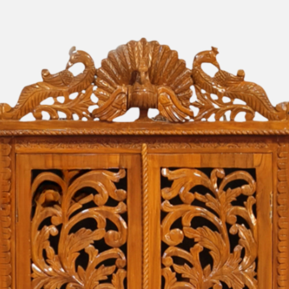 This pooja mandap has a huge peacock crown with spread wings and fine carving carved on the upper frame. This style provides elevation and makes the temple have a good traditional appearance. Each shape on the top is clean and smooth which shows expert craftsmanship. The carvings are arranged evenly to keep both sides balanced. The natural teak color polish highlights the crown and makes it shine beautifully. The top design adds a temple-like feeling to the entire structure. This crown feature completes the big pooja mandir with a perfect royal touch that fits well in any prayer area. The crown enhances the pooja space with its detailed and inspiring presence.