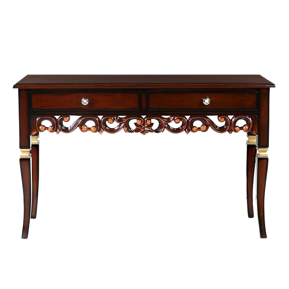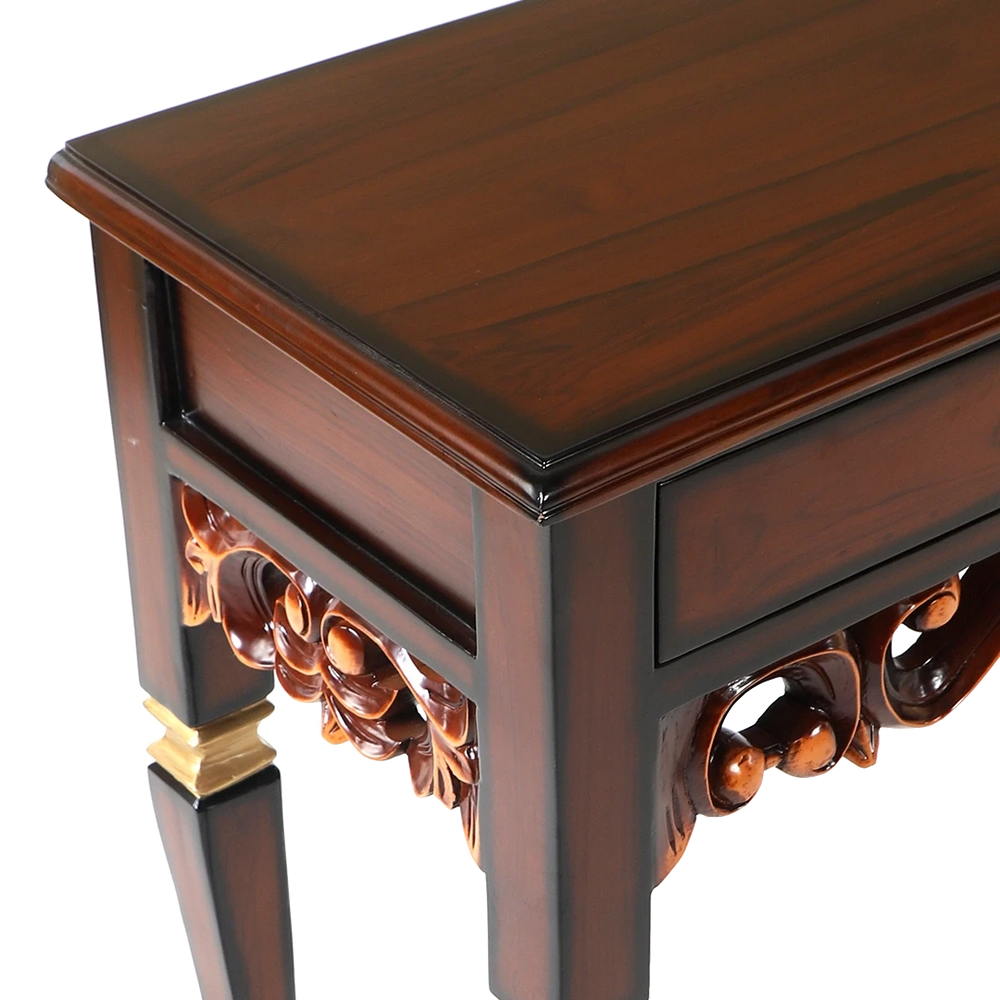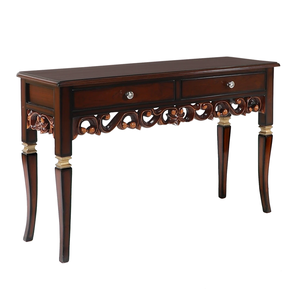 The Dignify console table is a true masterpiece with every aspect carefully designed to reflect artistry. The meticulous hand-carved details and precisely placed teak accents elevate this table to a level of sophistication. Its intricately carved front panels and gracefully curved legs showcase a commitment, to craftsmanship. Each feature is thoughtfully crafted to enhance the charm of your living area making this piece a timeless addition to your home decor that will continue to impress for years ahead.