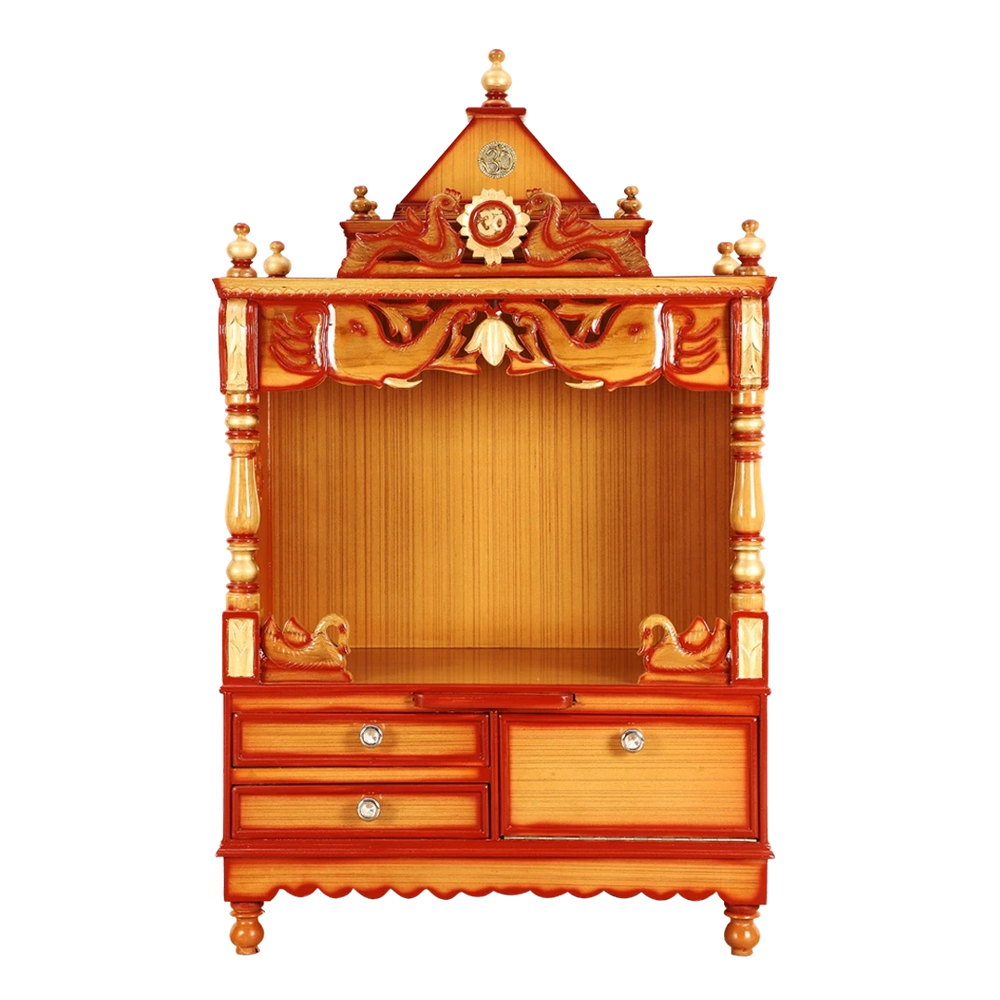 This Divine Home medium-sized wooden temple is a beautiful combination of craftsmanship and tradition. It is designed to bring peace and spirituality into your homes. This home temple is made from premium teak wood and it features unique OM motifs on top of it symbolizing the presence of the divine power. Intricate carvings of animals like swans and elephants enhance the beauty of this temple. The combination of the teak and gold color of this pooja mandir gives an aesthetic touch to your religious rituals. This wooden temple is equipped with spacious drawers and cupboards to store your pooja essentials along the temple comes with a detachable tray for diya and dhoop. It has a glossy finish which enhances its look and the light falling on it gives peace in the pooja room. To maintain the beauty of this wooden temple clean it with a dry cloth and avoid harsh chemicals to maintain its shine.