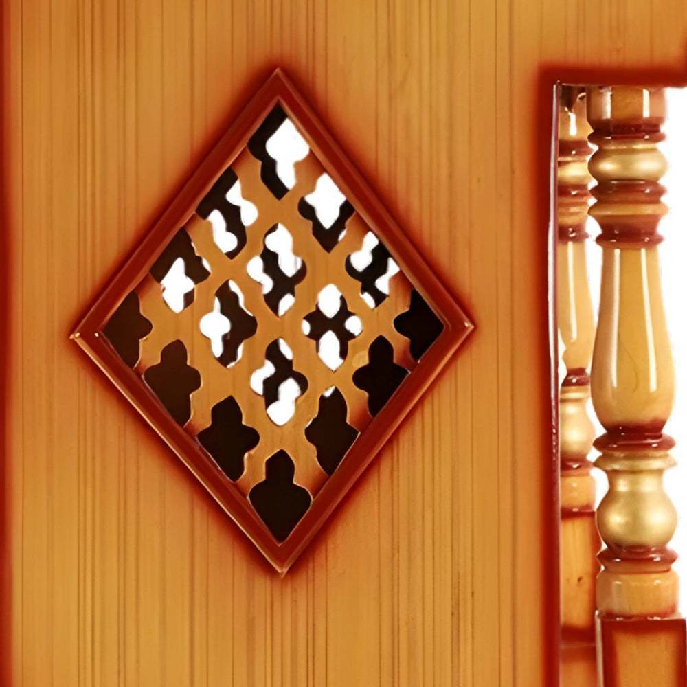 Our skilled artisans carry the traditional culture and handcrafted every piece of this wooden temple with precision. The pair of pillars provide stability and sturdiness to the temple. The detailed jali craft is a mixture of traditional and modern design. Jali pattern gives mesmerizing shadows when placed in proper lighting and allows light and air to pass through. The bell shaped design on both of the doors represents the cultural beliefs. The shikharas shape of our traditional ancient architecture is beautifully inculcated in our wooden temple.