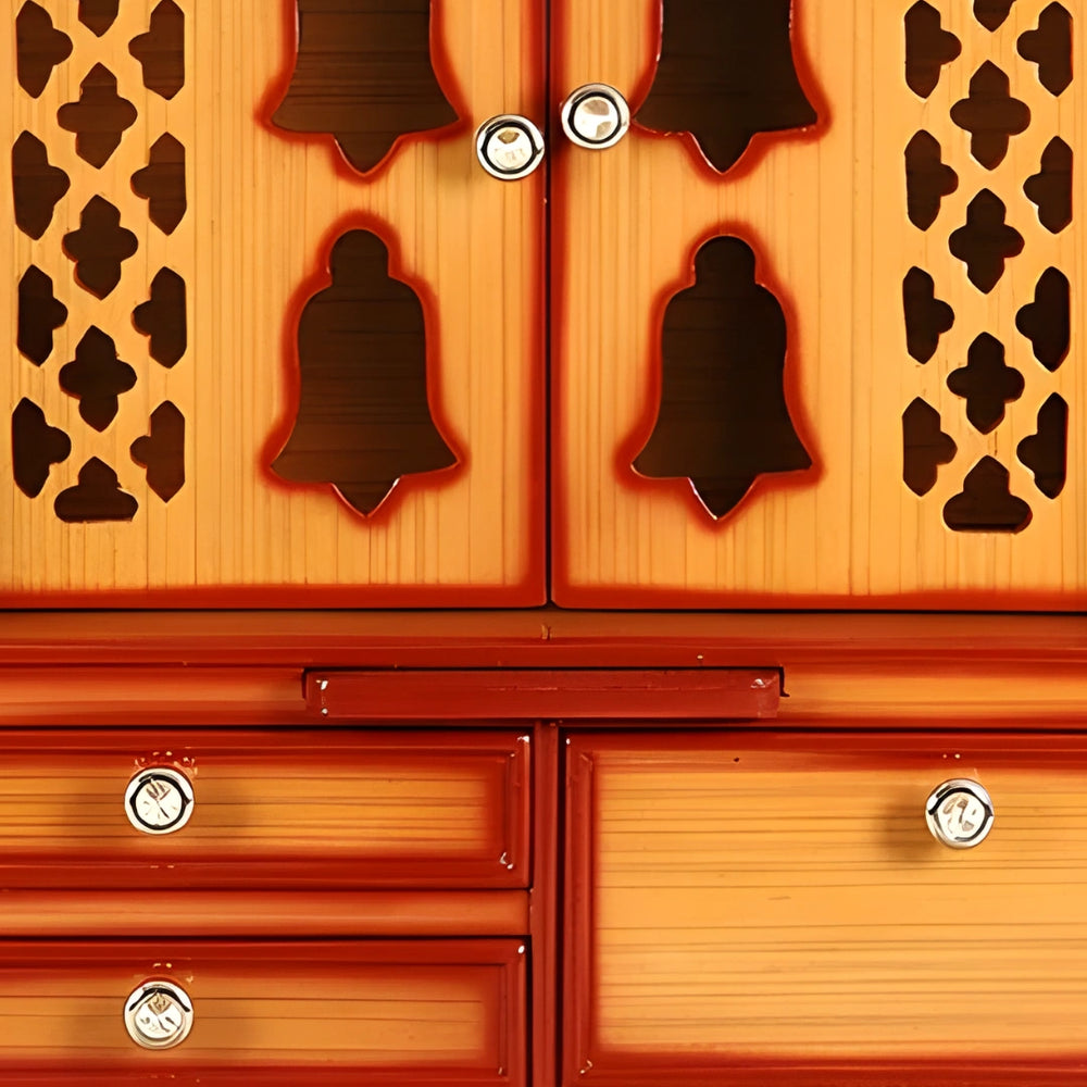Stability and Strength: The weight and the density of teak wood make the wooden temple design for home a stable and reliable material. The advantage of this strength is to support several idols and lamps, along with other pooja stuff without apprehension of damage. With heavy items put on it, the pooja mandir for home is sure to stay still because the density of teak makes the pooja mandir steady. A mandir design for home in natural teak color made of teakwood promises to be structurally tuned to withstand the test of time, ensuring that the house will offer a safe and lovely area for daily worship.