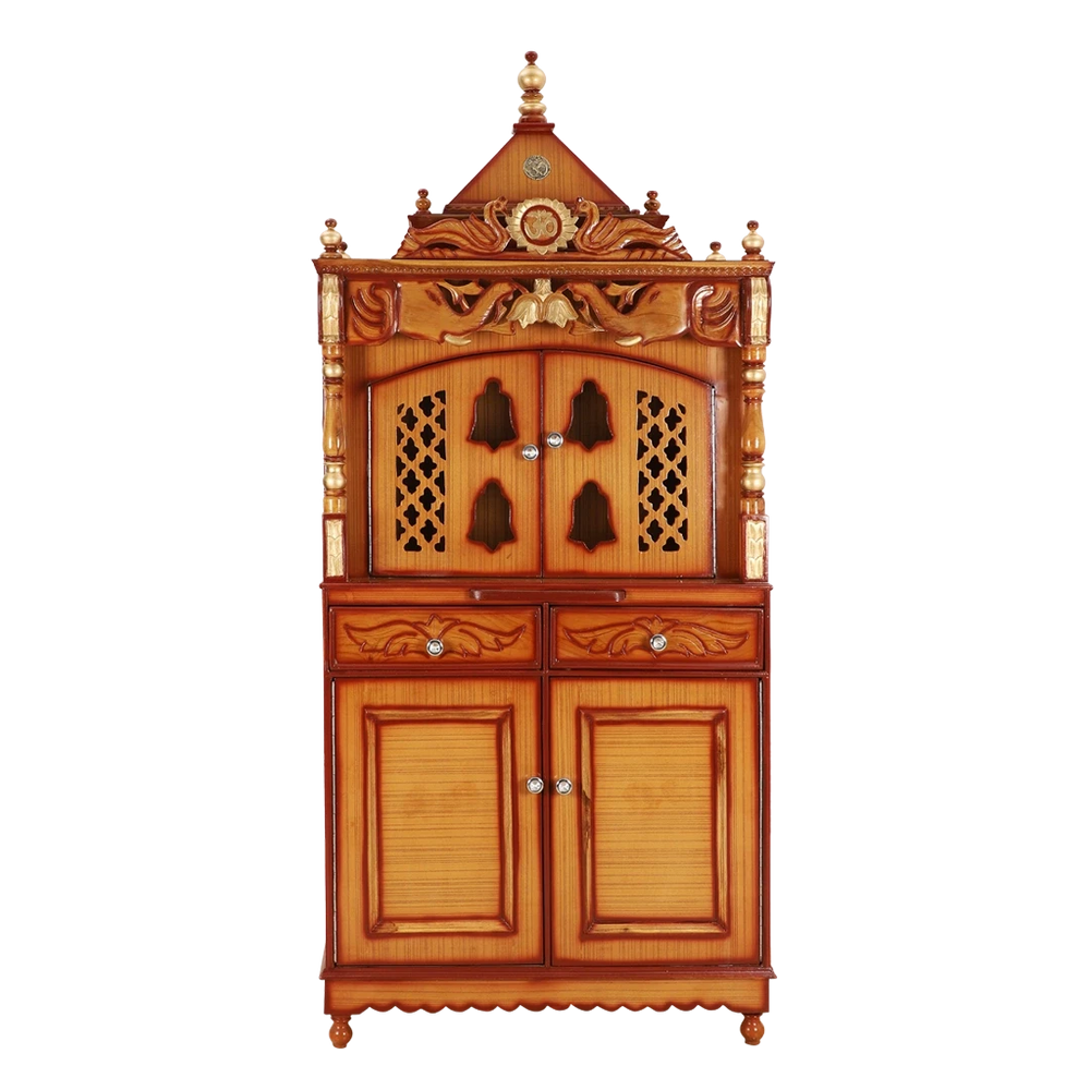 The elevated design of this 6 feet pooja mandir makes it stand out as a special piece of furniture. Its tall structure gives it a grand look and shows the importance of your worship space. This design creates a feeling of majesty and significance in your home. The big mandir design looks beautiful in teak color.