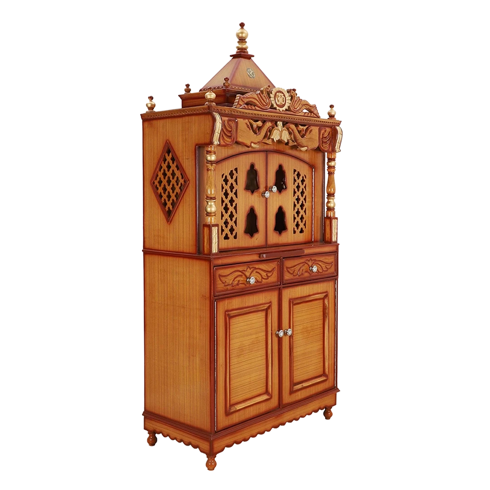 The Importance of wooden pooja temples has increased in modern times. Divine Palace Pooja Mandap is one of our finest handcrafted creations with beautifully detailed traditional designs. The natural teak color with gold accents gives an elegant and divine look to this wooden home temple. The Shikhara reflects a traditional touch to mandap support by a pair of pillars. The most unique feature of this mandap is the storage functionality. The mandap is equipped with a detachable tray, pull-out compartments and two huge cabinets. This space can be used to place all pooja essentials in one place, including lamps, oil, scriptures, and incense sticks. The durability of Teak wood combined with the glossy Melamine finish increases the lifespan of the wooden temple. The timeless beauty of this home temple is furnished with various spiritual symbols and detailed, intricate designs. The diamond-like knobs on the drawers make the temple more beautiful and all four legs provide stability and sturdiness to this wooden temple.