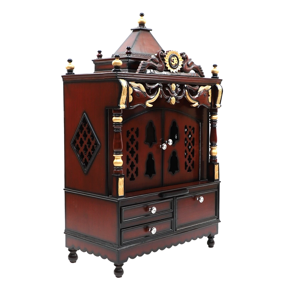 Discover the serenity of a designated pooja area to encourage spiritual development and unity. Pooja room is the only place in a home that spreads positive and spiritual energy. The Divya Darshan Pooja Mandir is made to enhance the sacredness of your home temple and is a true representation of traditional Indian craftsmanship. This wooden temple adds an elegant look to your spiritual area with its beautiful combination of rich brown and gold colors. The golden-carved Om symbol at the top center makes it all the more divine. The beautifully carved swans flanking the Om symbol represent purity and devotion that turn this temple into more than just a site for prayer. This wooden temple will be the centerpiece of your home. The doors feature intricate jali designs to pass through soft light. Handcrafted golden elephants on the pillars add a touch of elegance and tradition while the raised pooja platform ensures that your deities are positioned with utmost respect. Also, the temple offers drawers and a cabinet at the base, for storing all your pooja necessities.