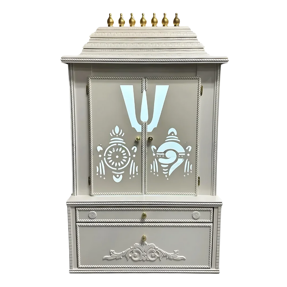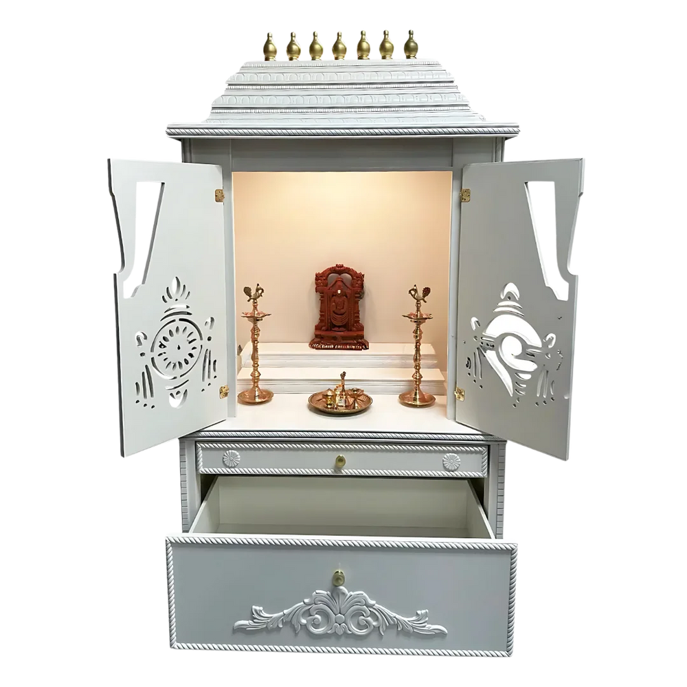 Designed for convenience, the large pull-out tray offers extended surface area during poojas or festivals. It provides additional room to accommodate either diyas, flowers or pooja articles without filling up the major stage. The tray closes and opens well and becomes flat when pushed in. It is wide and can be used to accommodate multiple idols or decorative thalis arrangement. This section can be of great help during festivals when you require extra space on pooja. The white color matches well with the brass thalis and pooja items and maintains the set to be neat.