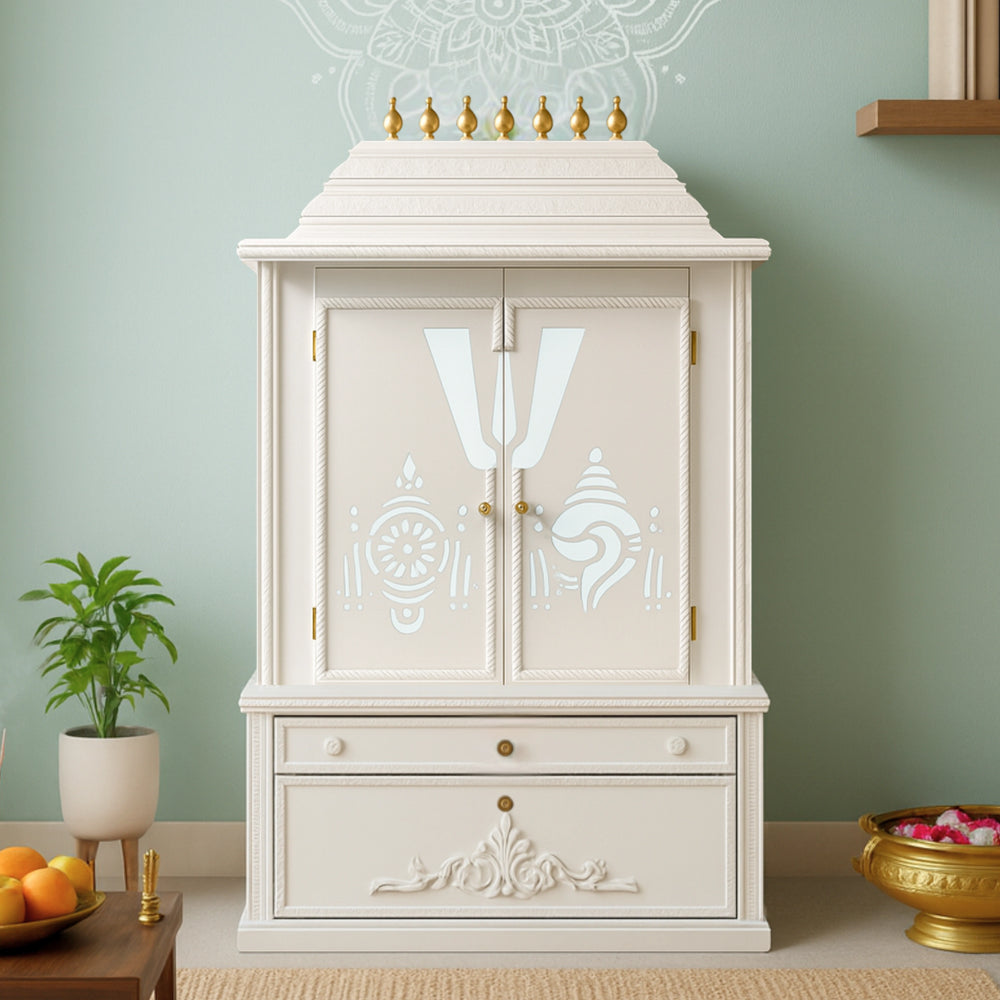 The top features a multi-step crown that enhances the vertical height of the pooja mandap, adding a majestic look from every angle. It is ended to look like the architecture of the traditional temples with impressive visual balancing with the rest of the frame. It has a temple inspired depth because of the detailed work throughout the ridges of the crown. This accent introduces spiritual emphasis in an upward direction as well as turning the unit into a home focal point. When viewed under soft lighting, the white color on the carved layers exudes calmness. It creates a subtle contrast against pooja items and adds height without visual bulk.