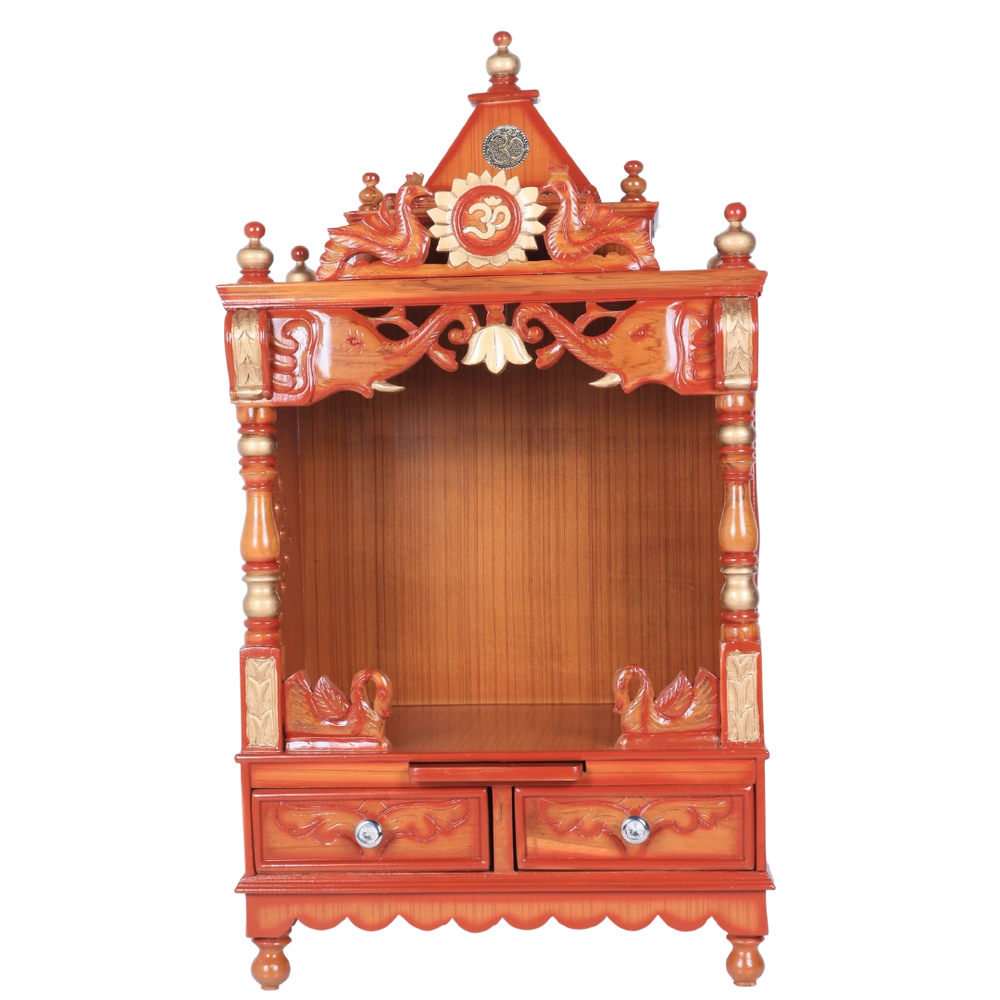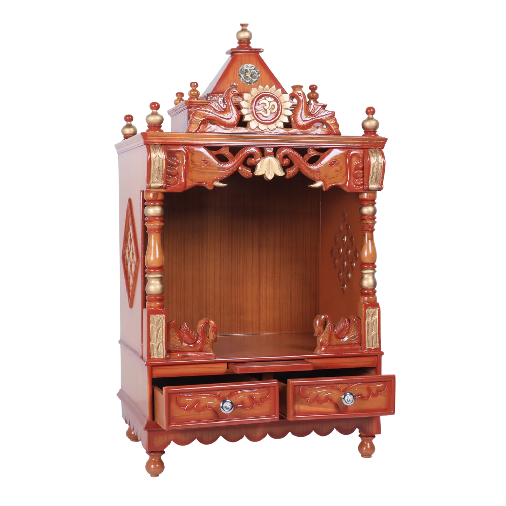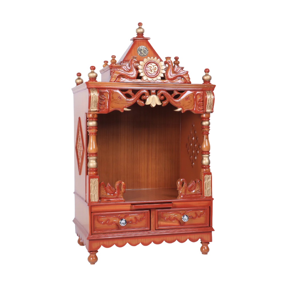 The intricate carvings on this wooden temple showcase the sacred 'Om' symbol, elegant swans, and ornate floral patterns. The detailed craftsmanship enhances the spiritual aura and beauty of the temple. The swans symbolize purity and grace, while the 'Om' represents divine energy and peace, making this mandir a spiritually uplifting addition to a home. The wooden temple appears more aesthetically refined due to these intricate carvings, which also give it cultural depth and sacred significance. The artistic detailing brings a unique charm to the mandir, making it a stunning centerpiece in any space.