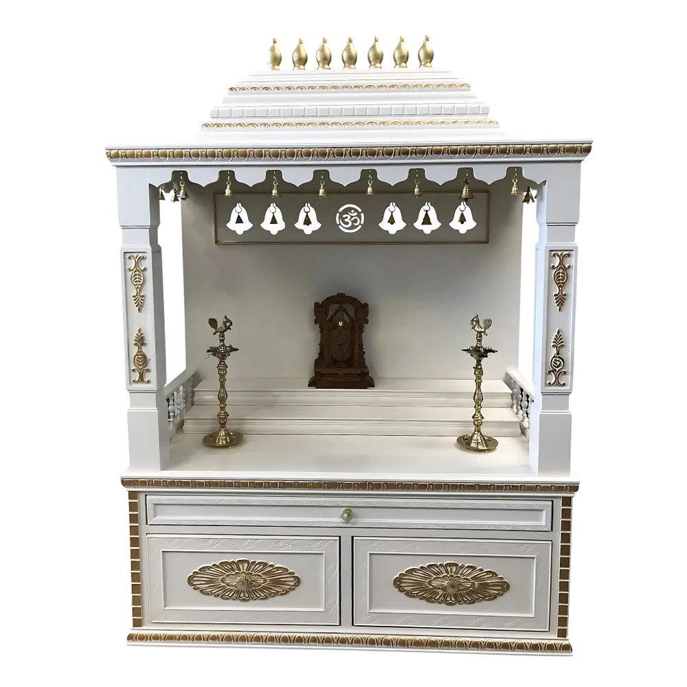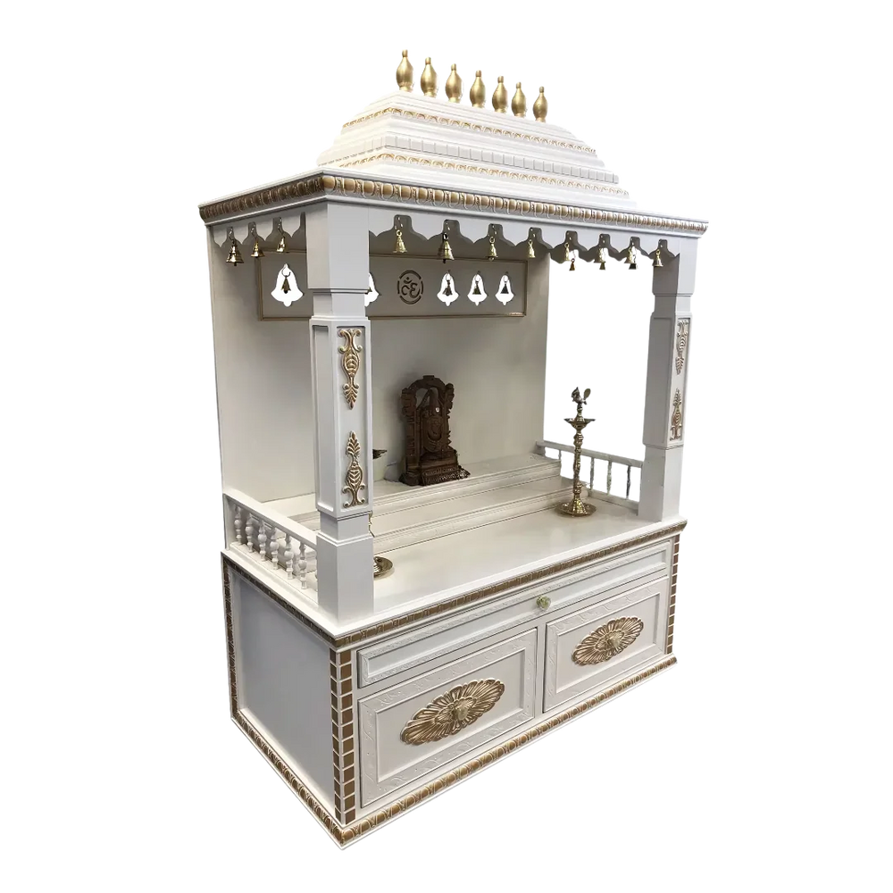 The drawers on the bottom of this large mandir for home allow for organized storage of puja materials. This increases the functionality of the large temple for home.The drawers have simple golden oval carvings that match well with the full design of the mandir. The golden color on the carvings stands out beautifully against the white background of this large wooden temple for home. The drawers are deep and large enough to store all your daily puja essentials safely. The large and wide platform of this big home temple, just above the two drawers, makes it easy to arrange all puja items.