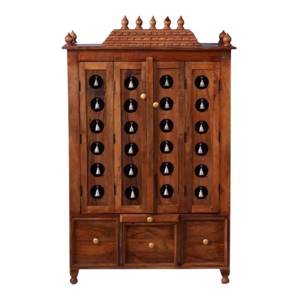 Each door has round black cut-outs with small bells that give a traditional look to this pooja mandap. The bells make a soft sound when touched and create a peaceful feel during prayers. Their even placement brings a neat and balanced look to all four doors. These features give the mandap a proper big temple feel. The brown color of the wood makes the bells shine more. This door design looks nice and keeps the traditional style. The doors open and close smoothly with strong hinges. This design adds meaning and comfort to your daily pooja.