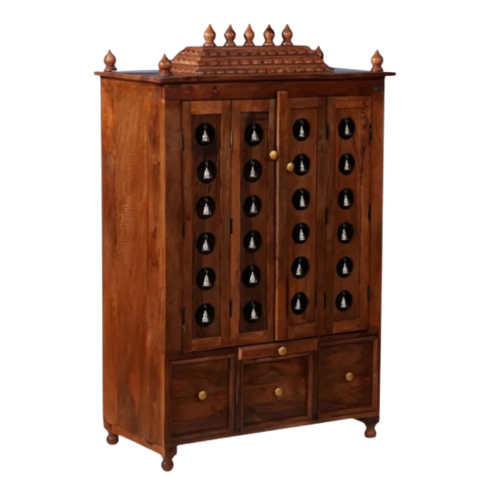 The top of this mandir has a stepped dome shape that gives it a bold and grand look. It looks like the top of South Indian temples, adding a spiritual feel to your big home temple. Small domes on the sides make it look even taller. The teak color finish makes the carved designs stand out clearly. This large pooja mandir is not only useful but also looks like a spiritual tower in your home. The dome adds height and meaning to the design. It gives the top part a royal and well-shaped look. The strong design of the dome also keeps the overall structure balanced and steady for long-term use.