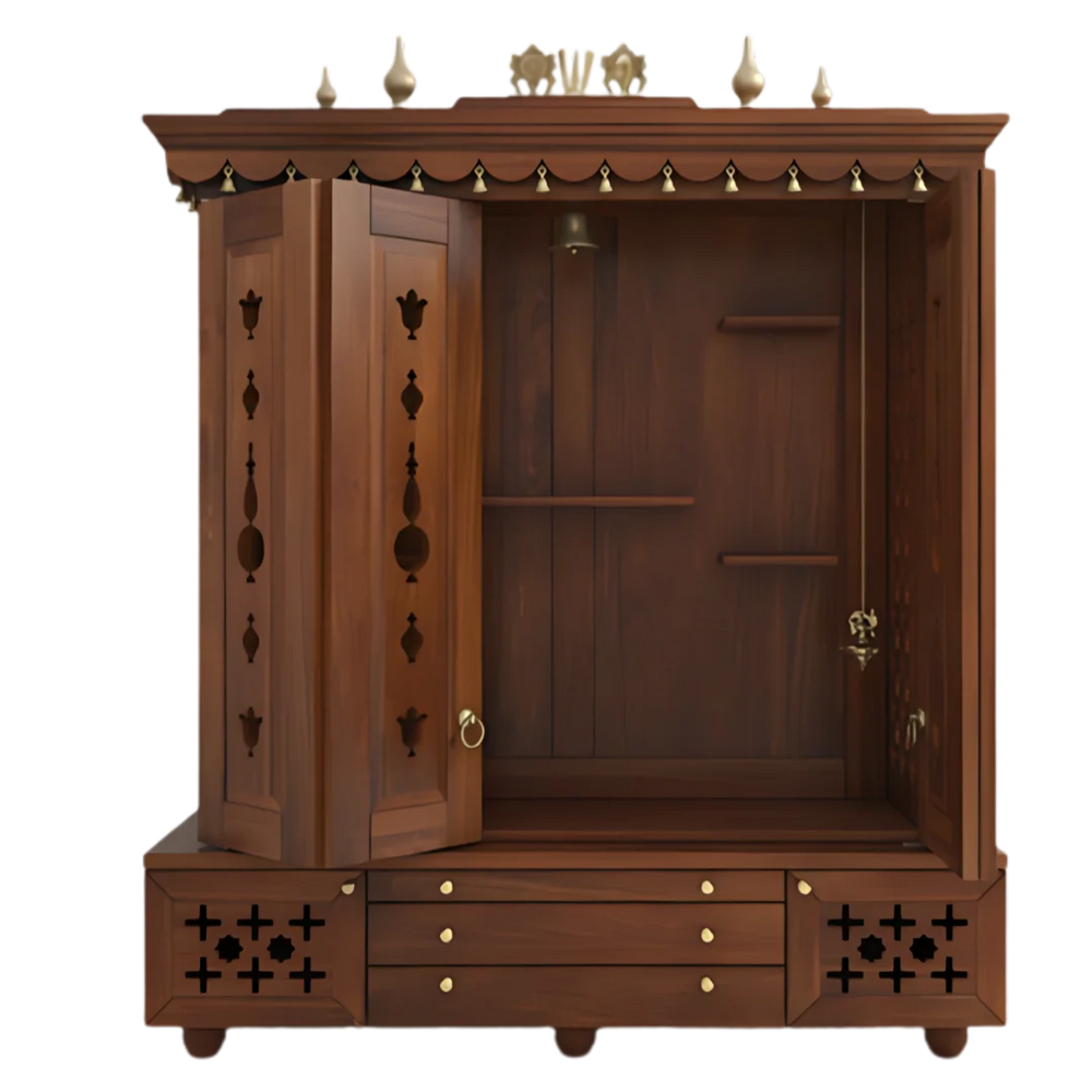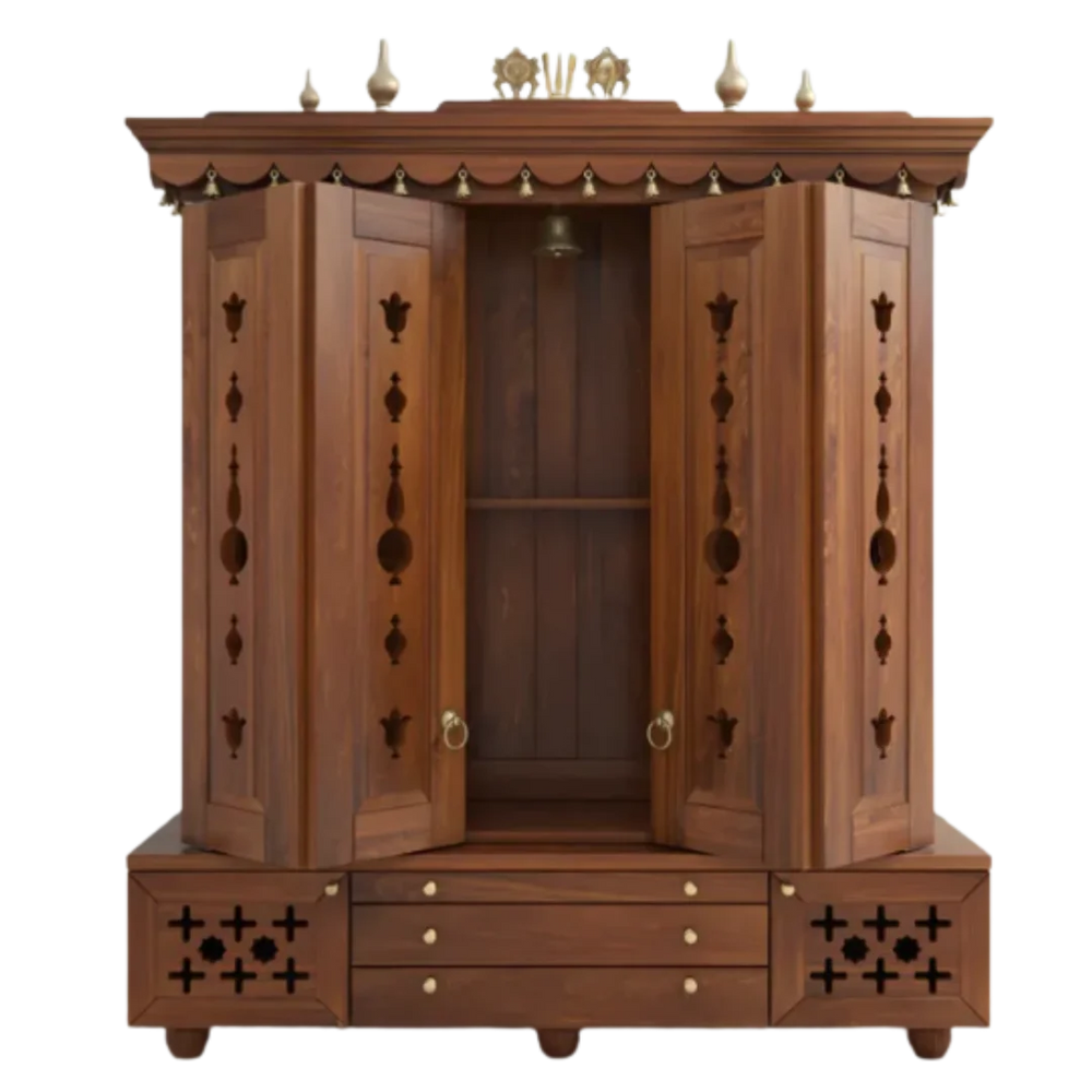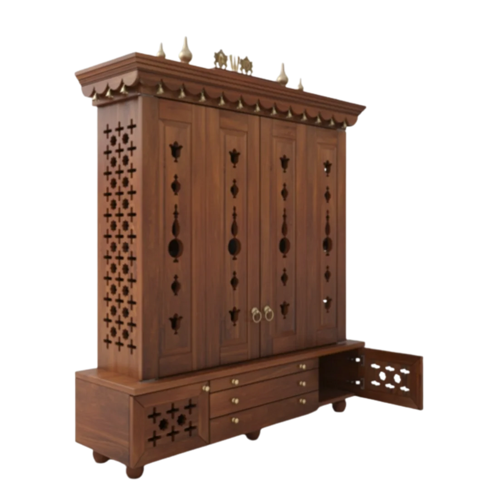 The mandir has a grand front with deep carvings and holy designs. Each door has open cut shapes that allow air to pass and keep the traditional look. The strong teak color panels give a bold and rich feel to this big pooja mandir. Brass knobs match the brown color and add to the temple style. The tall doors cover the prayer space fully and help you stay focused during pooja. The door design follows old temple styles with even space between patterns. This setup makes the mandir look grand from every side. The handles are placed at a good height so they are easy to use. Their round shape gives a firm grip and daily comfort.