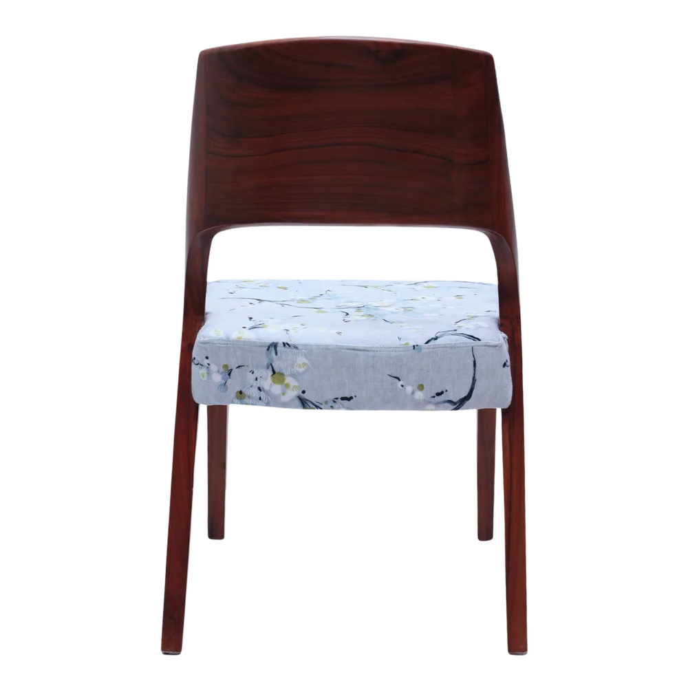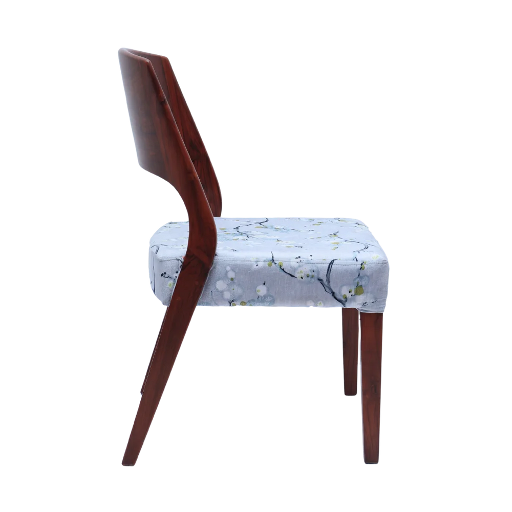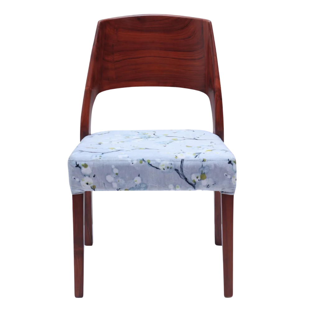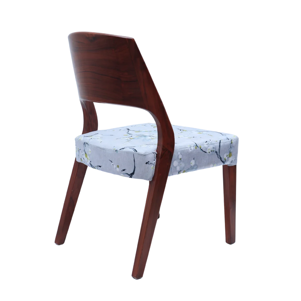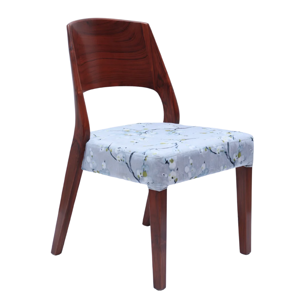 The Elevate Teak Wood Dining Chair has a clean and neat shape with a nice mix of curves and straight lines. The solid brown color wood frame gives a rich and warm look that adds beauty to any dining space. The backrest is made from one curved piece that gives full support to the back and keeps a modern look. The seat is covered with grey color fabric and has a soft floral pattern which makes it a stylish wooden chair for dining table setups. The comfortable seat and strong base make it good for daily meals and special gatherings. The slim shape and tapered legs give a light look while keeping the chair strong and steady. This dining chair brings modern charm to your dining room while giving good comfort. The brown color polish shows the natural wood grains which add warmth and character. Whether you are adding one chair or changing the whole set this wooden dining chair stands out with its smooth finish and neat details. It gives daily comfort with a timeless and stylish look for modern homes.
