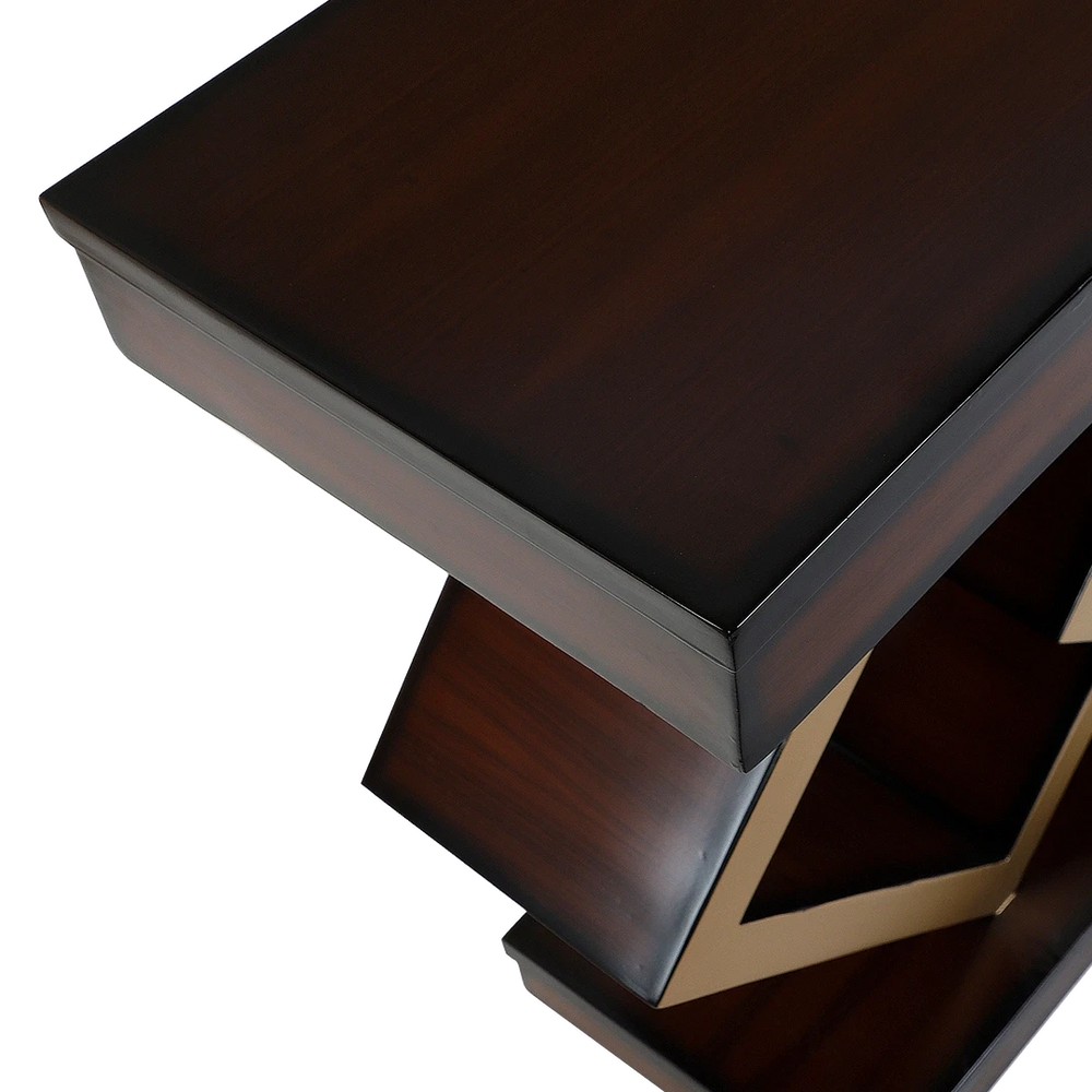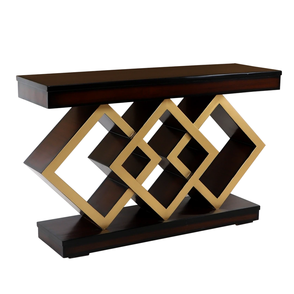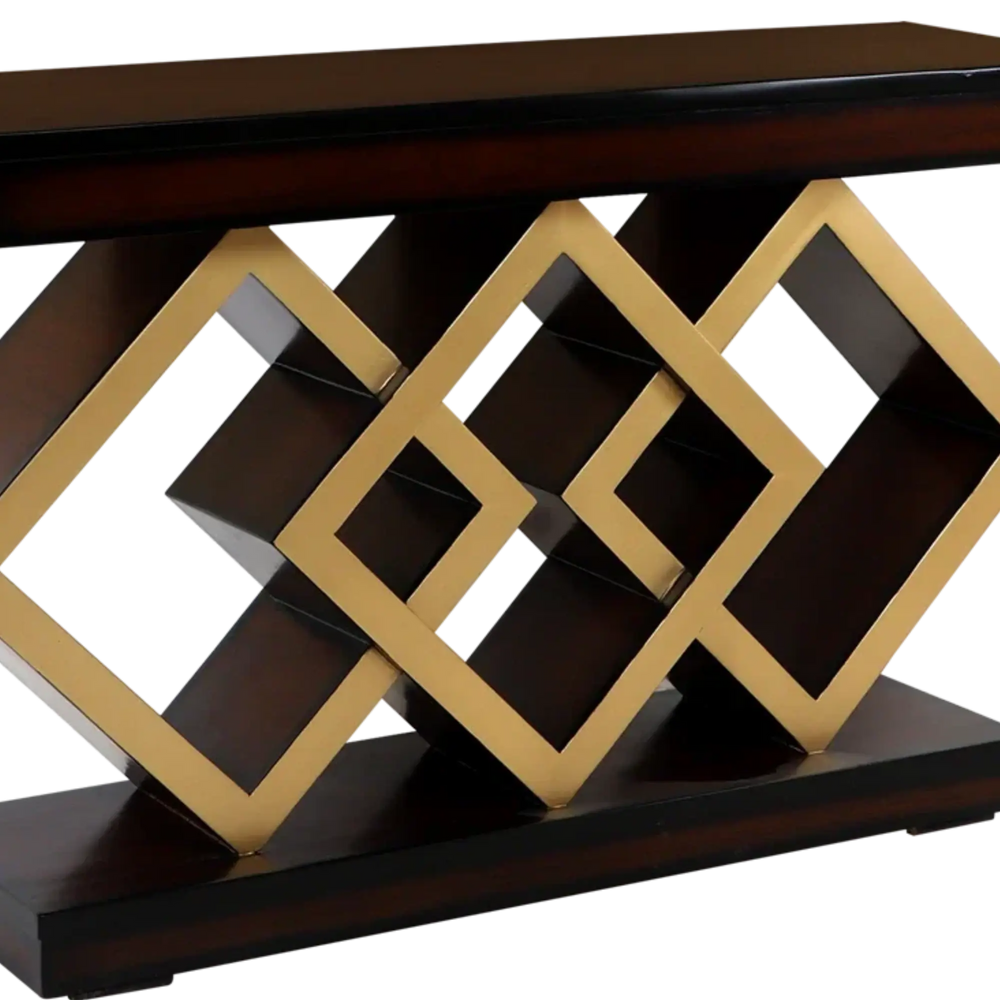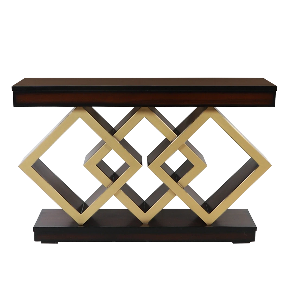 A console table can transform the look and feel of your space with its design and elegance. The Elite console table is designed to add a fashionable accent to any interior design. It is an excellent addition to your home's décor because of its dark brown top and unique geometric base. The base is made up of large, gold-finished diamond forms that contrast well with the dark wood to enhance the entire design. The beautiful design of the table gently improves the room's attractiveness without taking up too much area. This console table combines style and utility and is perfect for both decorative and practical usage. Its sleek lines and finish give it a stylish centerpiece anywhere from the living room to the hallway. The Elite console table complements a variety of décor styles and gives sophistication and elegance to any environment. Add this beautifully crafted table to your home and experience its elegant appeal today.