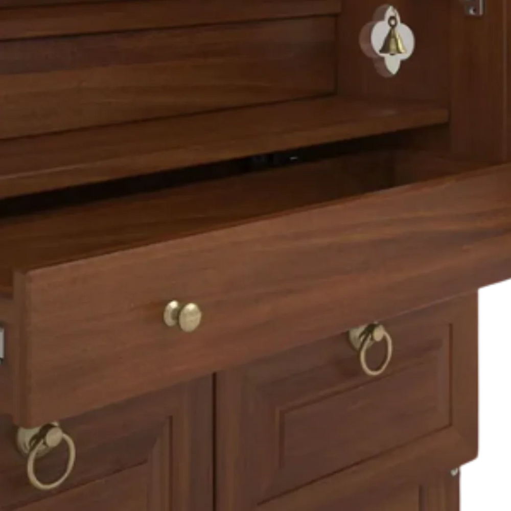 There is a wide pull-out drawer in the middle of the base. It is useful for keeping incense diya plates and prayer books. The drawer moves smoothly and gives you neat storage under the pooja area. The handle is easy to hold and suits the look of the mandir. You can also use this space to keep bells or holy threads. It helps in daily pooja by giving easy access. The drawer fits well with the cabinet below. Its color matches the teak finish of the mandir. The drawer front is strong and lasts long. It keeps the pooja space clean and saves space at the same time.