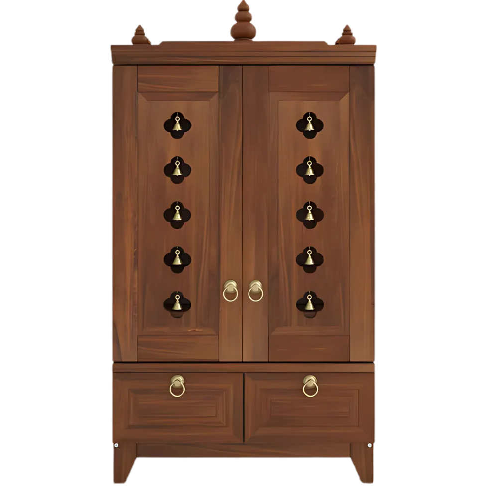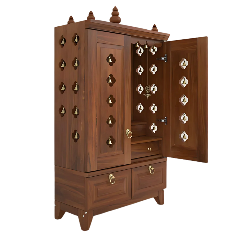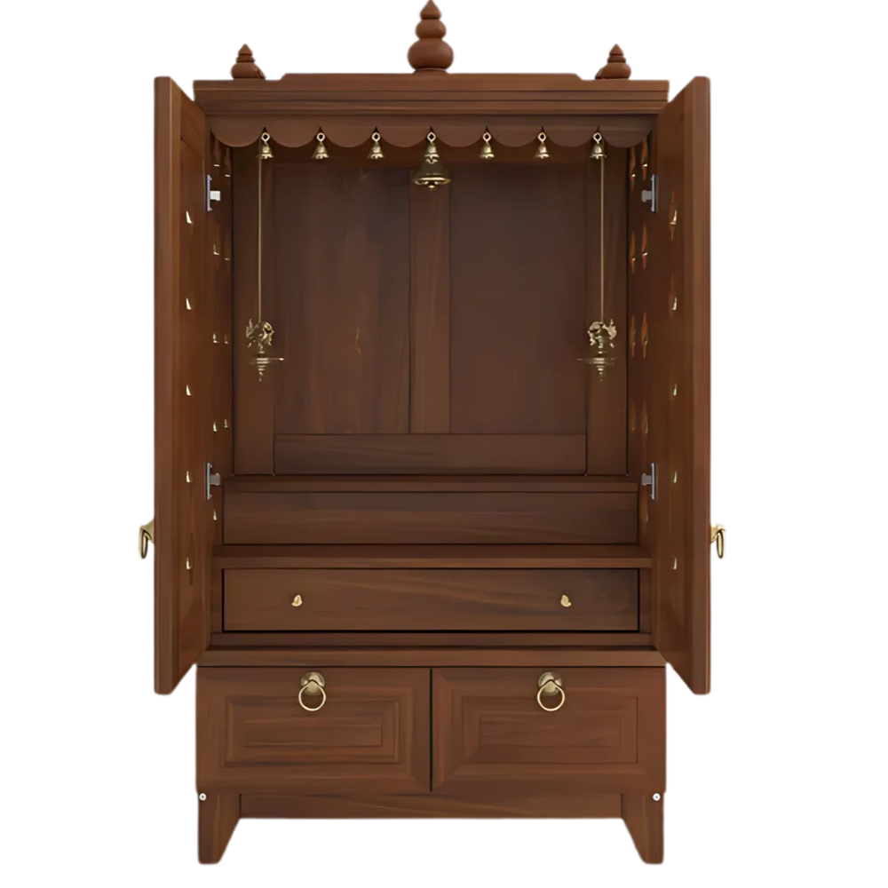This big temple for home is made with traditional style and smart design. It has a tall shape and neat layout. There are bell holders beside the pooja mandir, and it also has a dome-like top that gives it the appearance of a real temple. On the front, you will find an open space that’s suitable for putting your idols and pooja items. You can easily use it for standing prayers and maintain a good height. It includes a large drawer and a cabinet at the foot of it to hold incense, diyas, books, and oil. The back wall is plain and looks nice near a wall or in a corner. You can keep this mandir in the living room or a prayer room. It fits well in any space. The knobs and bell holders add a nice touch without making it look too heavy. The base is strong and raised slightly, giving it a temple feel. The mandir is finished in teak color and shows natural wood grain. The brown shade makes the space feel calm and matches Indian home style well.