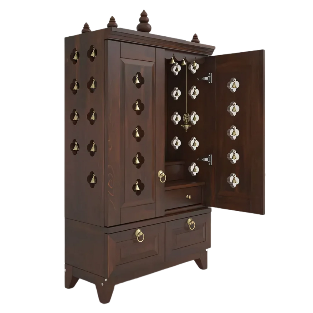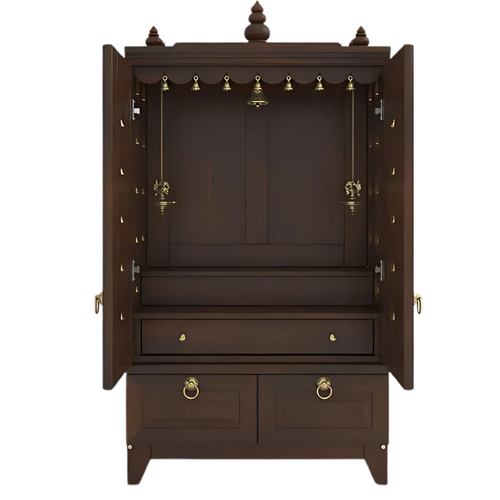 This big temple for home is made with traditional style and smart design. It has a tall shape and neat layout. There are bell holders beside the pooja mandir, and it also has a dome-like top that gives it the appearance of a real temple. On the front, you will find an open space that’s suitable for putting your idols and pooja items. You can easily use it for standing prayers and maintain a good height. It includes a large drawer and a cabinet at the foot of it to hold incense, diyas, books, and oil. The back wall is plain and looks nice near a wall or in a corner. You can keep this mandir in the living room or a prayer room. It fits well in any space. The knobs and bell holders add a nice touch without making it look too heavy. The base is strong and raised slightly, giving it a temple feel. The mandir is finished in wenge color and shows natural wood grain. The brown shade makes the space feel calm and matches Indian home style well.