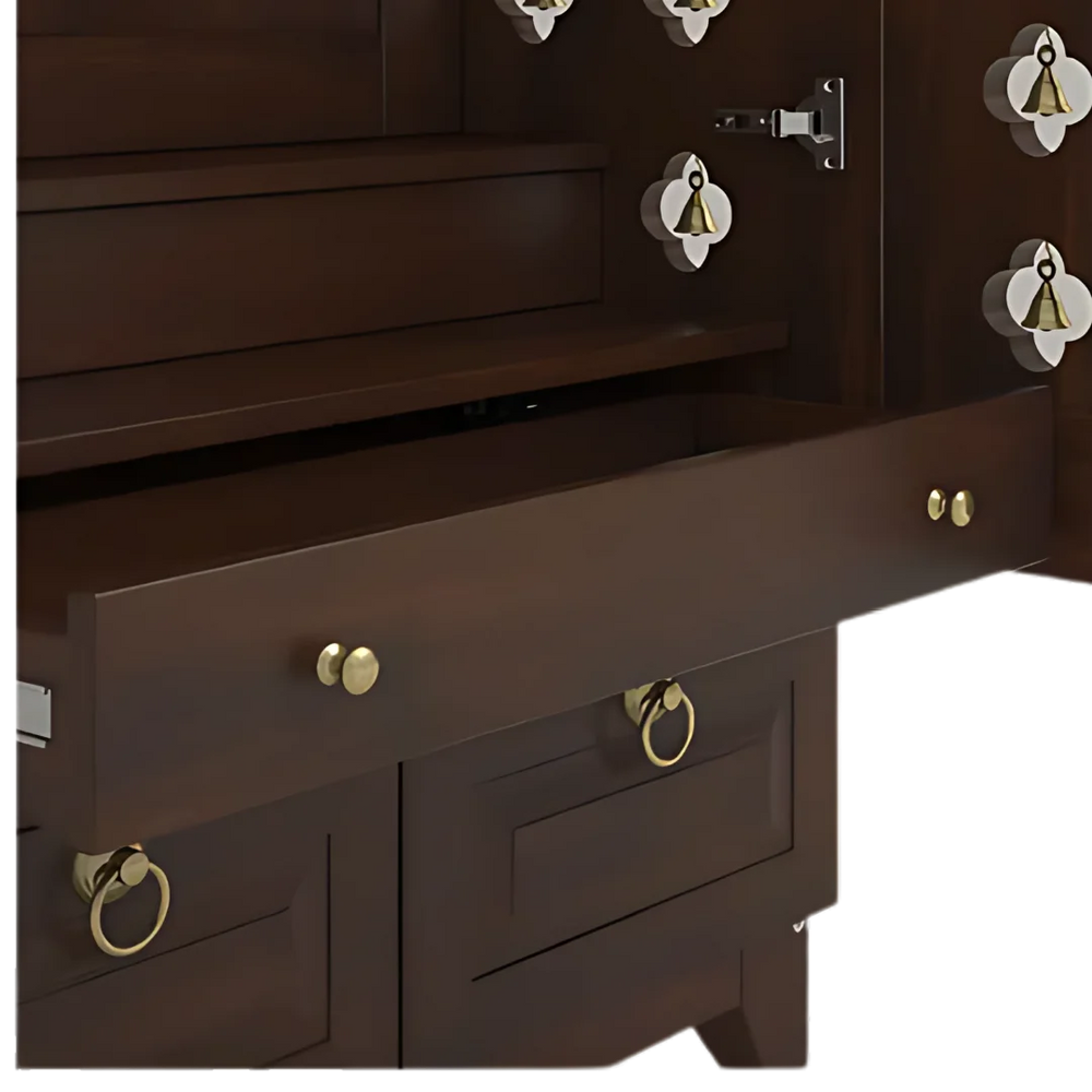 The two lower doors open to a deep cabinet that is good for big items like oil lamps vessels and pooja kits. It helps keep the area neat and clean. These cabinets are useful for people who do pooja every day and need extra space. The shelves inside help you place things in an orderly way. The doors close tightly to keep the items safe. The full design looks balanced from top to bottom. These cabinets match the brown color of the mandir. The depth is good for many types of storage. Their large size makes them fit for extra pooja items. They also keep your valuable things hidden and safe.