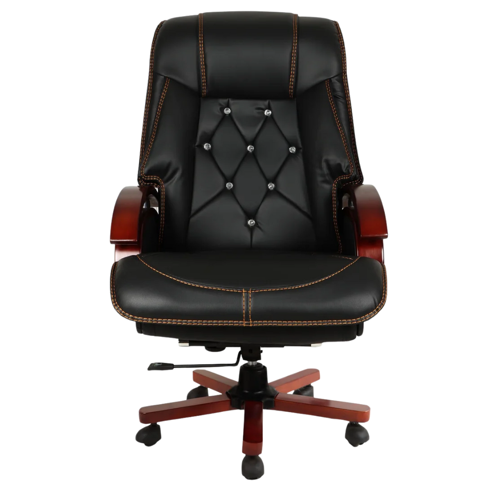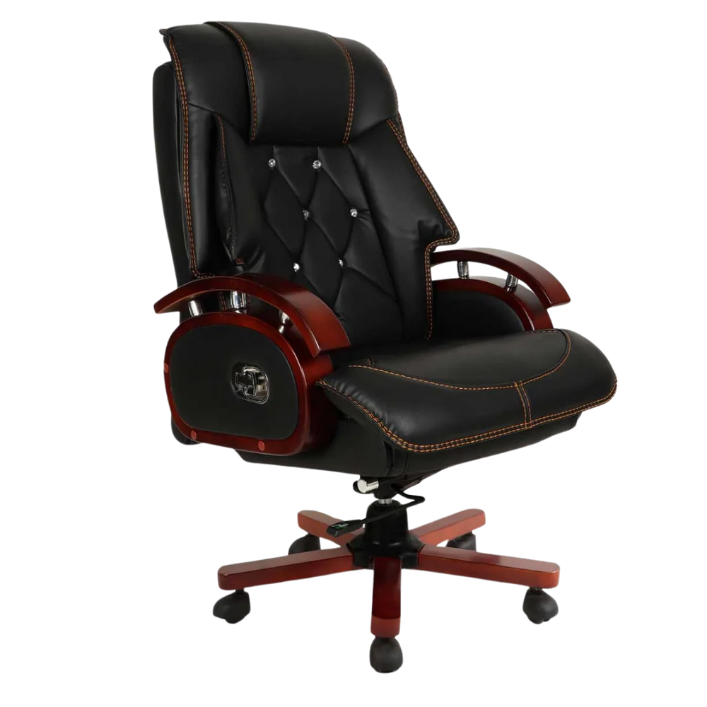 This leather office chair gives support to your upper back, shoulders and neck. It keeps you comfortable during long work hours. The high backrest helps you sit straight and reduces pressure on your spine. It is a good choice for tall people. The chair gives a strong and boss-like look. It helps you keep a straight posture all day without much effort. This chair is perfect for executive rooms and looks great in air-conditioned cabins. The black color makes your office look rich and smart. It helps you sit well during meetings. The tall backrest also adds to the chair's bold look. It keeps you from feeling tired after sitting for a long time.