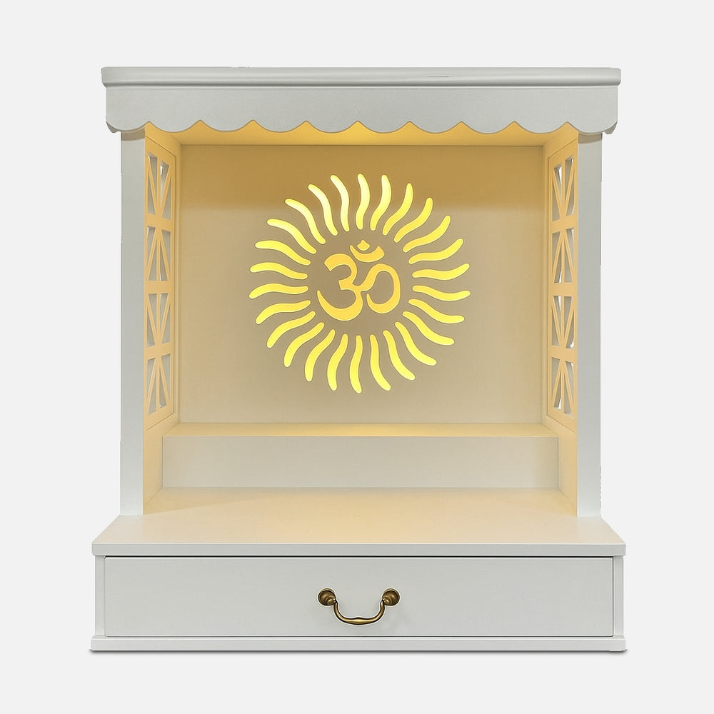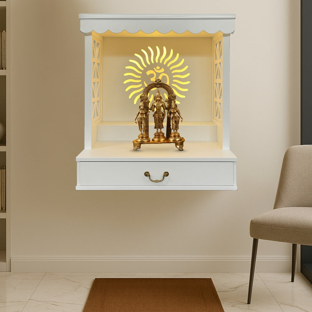 The Girivasa Teak Wood Mandir brings a peaceful and divine feel to your home with its elegant white finish and simple modern design. The temple is neatly designed and combines the contemporary design with the traditional spirituality. The rear side depicts a luminous Om sign accompanied by sun rays which forms a spiritual center to pray every day. The side panels have geometric cutouts that let light pass through nicely. The scalloped roof line creates the effect of a traditional temple. It has a big size drawer where incense and other pooja material is stored. The white exterior is bright and contrasts the warming interior which illuminates your idols. There are star cut outs in the side panels which ensure that the temple appears interesting at all angles. This pooja mandir can be mounted on the wall to save floor space. The stepped platform inside keeps your idols at the right height. The drawer has a curved handle that keeps the traditional look. This home temple brings calmness and devotion to modern living and helps families connect with their spiritual roots every day.