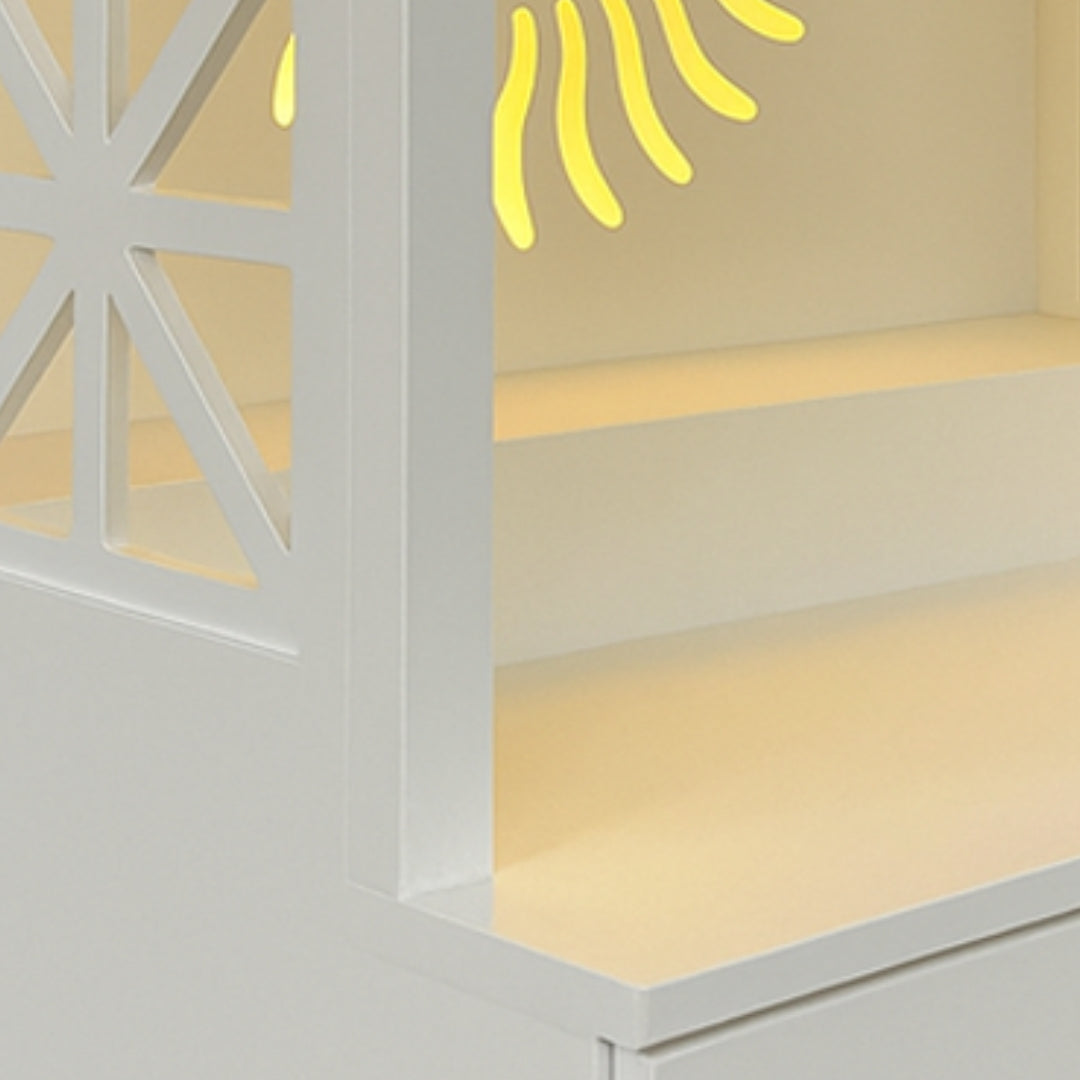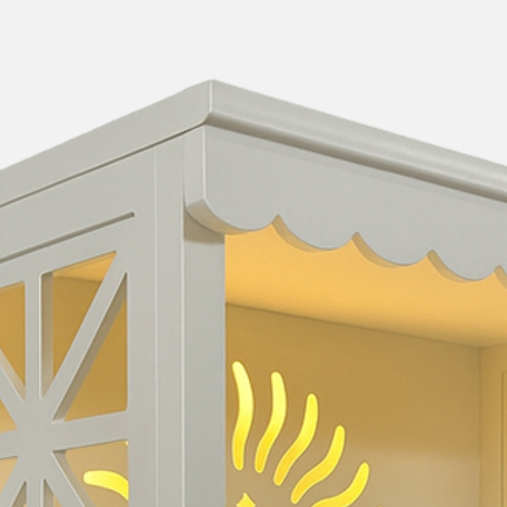 Both side panels of this home mandir have star-shaped cutout designs that give it a simple and elegant look. The patterns let sunlight pass through which brightens the space inside the temple. The cutouts also create changing shadows as the day moves. Each design is carefully made to keep the mandir balanced and even. The white frame makes the patterns easy to see on any wall. The panels also allow air to flow which keeps the interior fresh and dry. The simple geometric style suits modern homes while keeping traditional values. These details make the mandir both stylish and spiritual for daily worship.