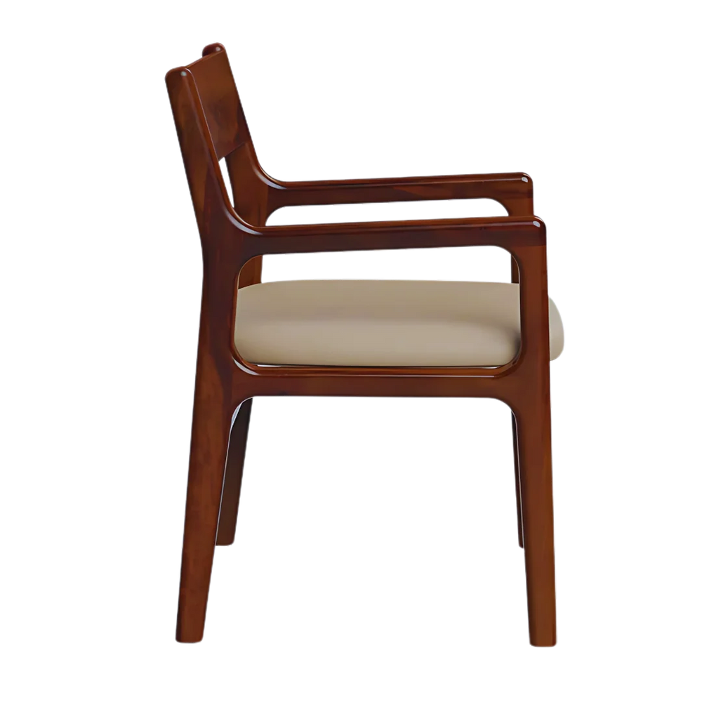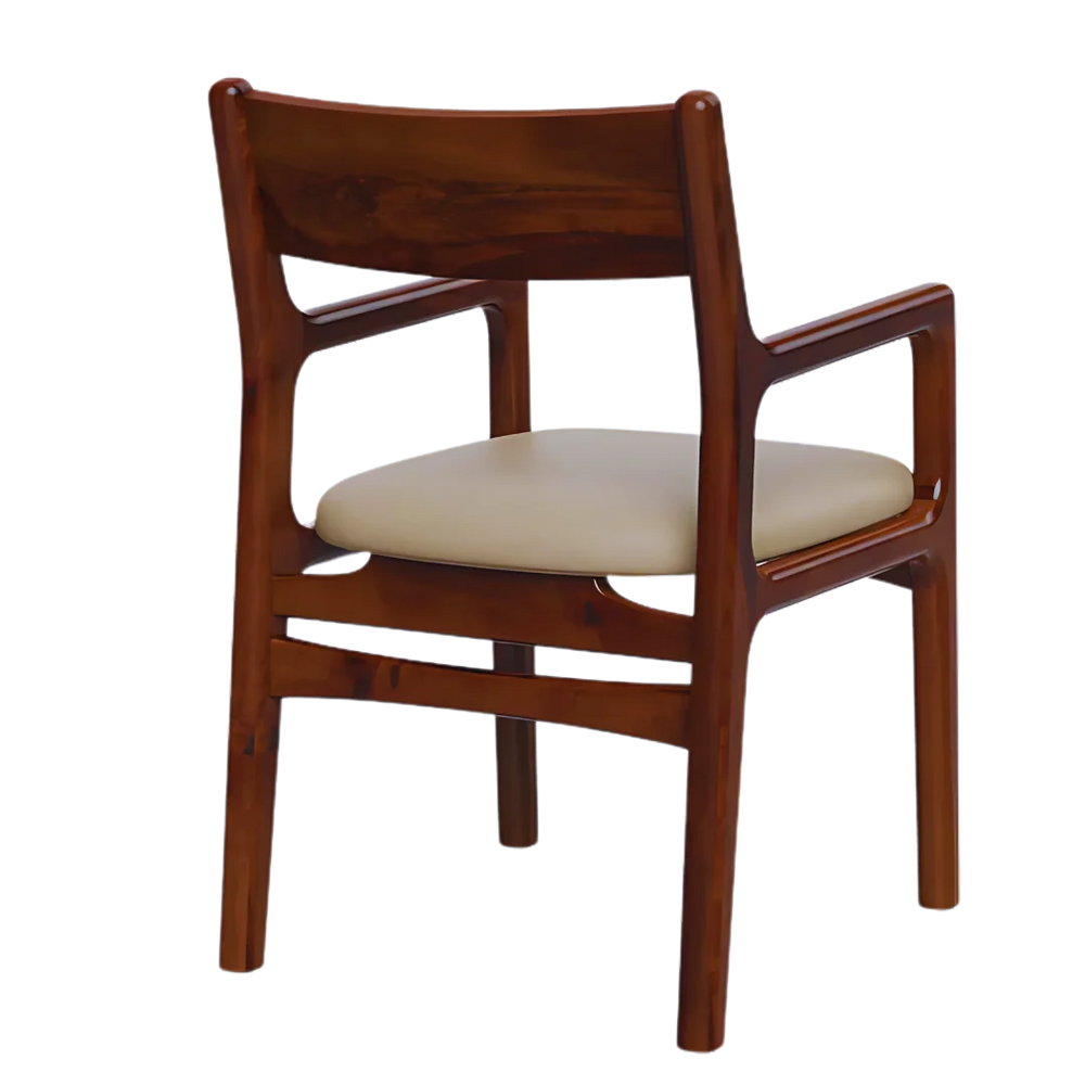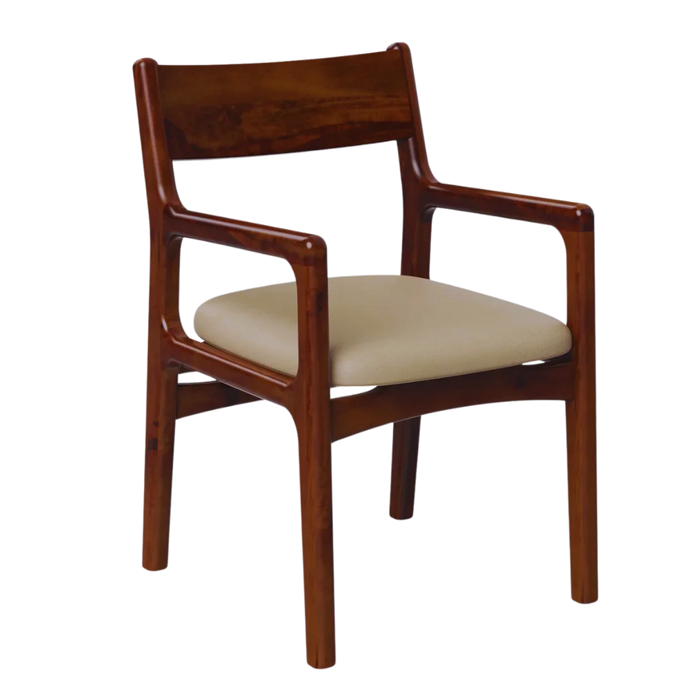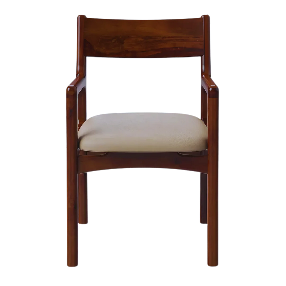 The Haven Teak Wood Arm Chair brings strength and style with its clean and modern design. This wooden chair has a softly curved backrest and smooth armrests that give both comfort and a neat look. The rich brown finish shows the natural wood lines and adds a warm feel to any bedroom or living room. The light cream cushion on the seat adds a soft and elegant contrast to the wooden frame. Its simple design fits well in small corners or open spaces. You can use this chair as a wooden bedroom chair or a wooden chair for living room seating. The flat base keeps the chair stable and firm on the floor. The strong frame is easy to clean and made for long-lasting use. The chair’s light structure makes it easy to move between rooms when needed. The smooth polish on the wood keeps the surface looking fresh even after daily use. The backrest height supports a natural sitting posture which helps in longer sitting hours.