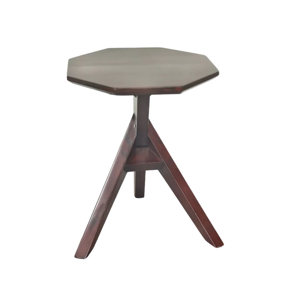 Teakwood table with Hexa top, sturdy tripod base, unique design.