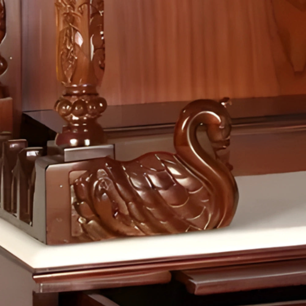 On the base shelf of this mandir for home, two swan-shaped holders stand out in the front corners. These sculpted additions bring a unique element of grace. The carved swans are placed symmetrically and extend upward to form soft dividers for the idol space. Though ornamental, they contribute to visual boundaries on the open base platform. The design complements the floral theme carried across the pooja mandir for home. These accents add personality and a distinctive identity to this home temple. Their presence makes the base feel dynamic and less plain.