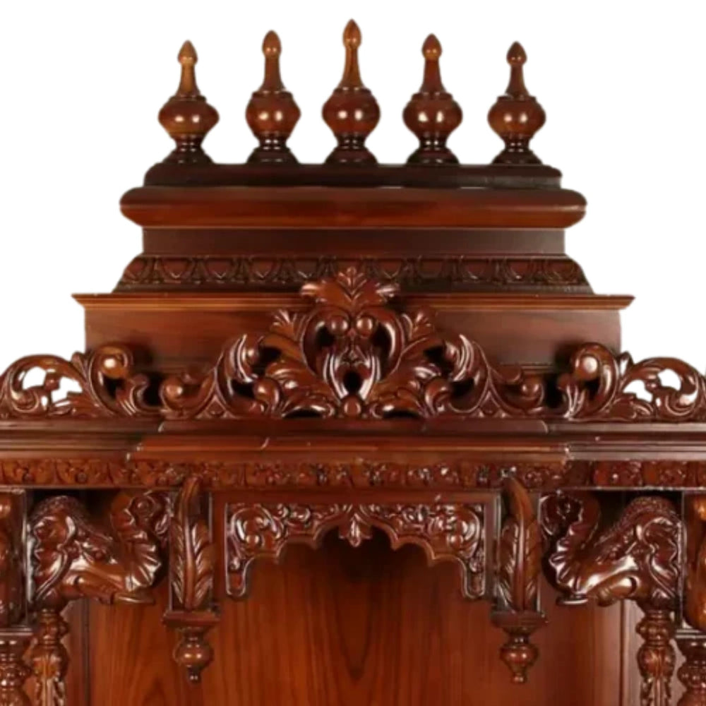 The top crown of this mandir for home features multiple spindle-shaped ornaments in sequence. These give the structure a grand temple-like appearance that resembles South Indian gopuram style. Each spindle adds balance to the top layout, while the large floral carving beneath them becomes a central element. This feature draws immediate attention and defines the temple’s rich profile. The layered styling adds dimension and depth to the pooja mandir. This portion enhances elevation and makes the mandir visually dominant in any room. Perfect for a wooden temple for home that desires a traditional impact.