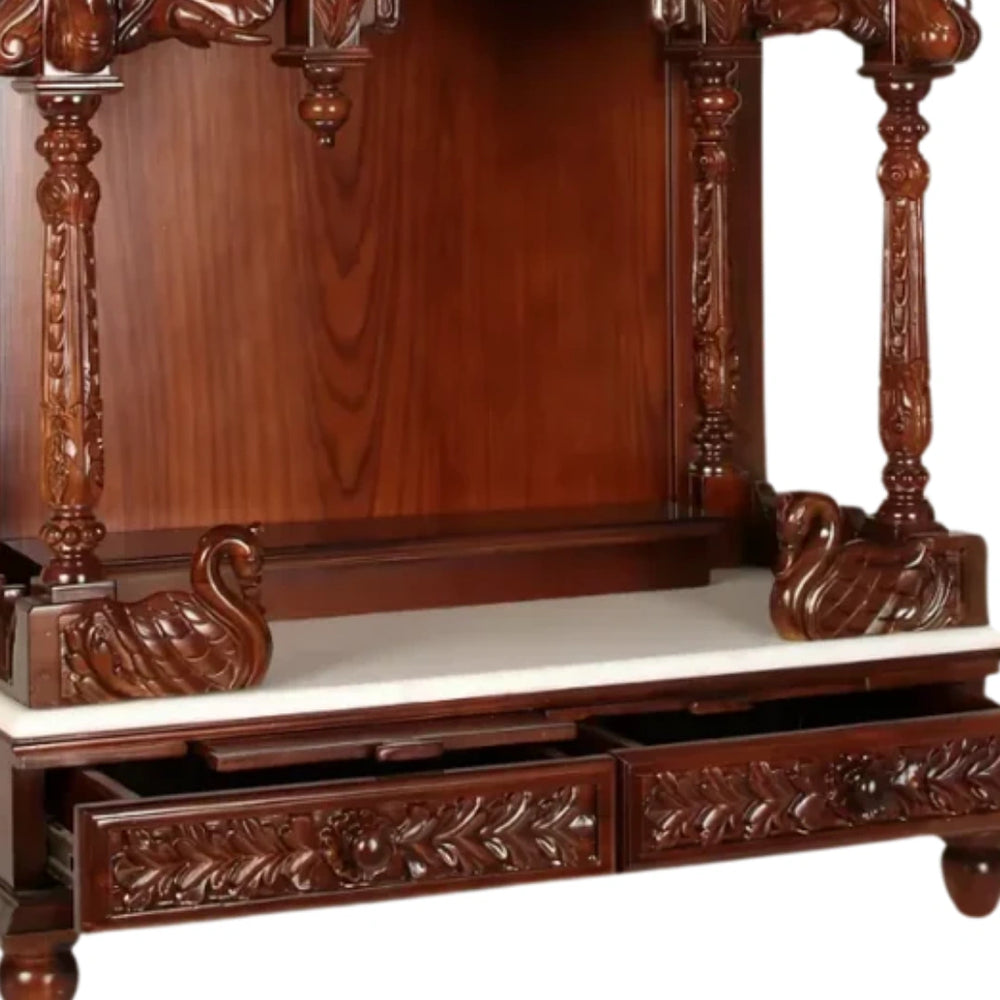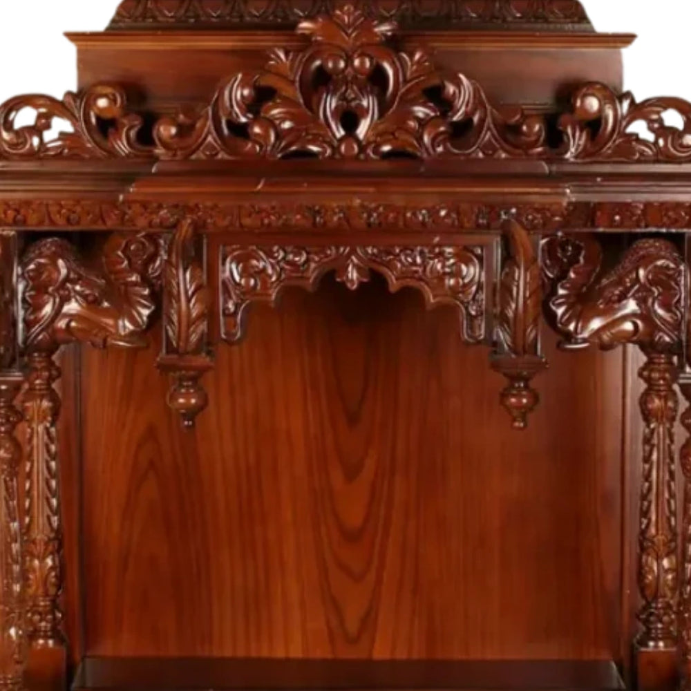 This pooja mandir is a rich expression of divine tradition with bold carvings and an elevated design that reflects Indian architecture. The top structure features ornate detailing that adds visual weight and grandeur to this wooden temple for home. The front pillars are shaped with deep cuts and grooves, showcasing layered craftsmanship. The elevated back panel and base shelf form a strong layout for arranging idols or frames neatly. The extended ceiling canopy adds a shadowed feel, enhancing the ambiance during prayer. Symmetrical motifs cover the front, including floral strokes and panelled designs that draw attention to every corner. On both sides, the vertical carvings blend beautifully with the overhead design. The base unit includes drawers with floral engravings and pointed legs, offering storage with character. The rich brown color finish is smooth and reflective of a deep heritage appeal. This pooja mandir for home suits spacious settings and can serve as a central point for spiritual activity. The balanced layout makes this home temple both functional and attractive, with every part contributing to its devotional charm. The brown color adds warmth and grace to the overall appearance.