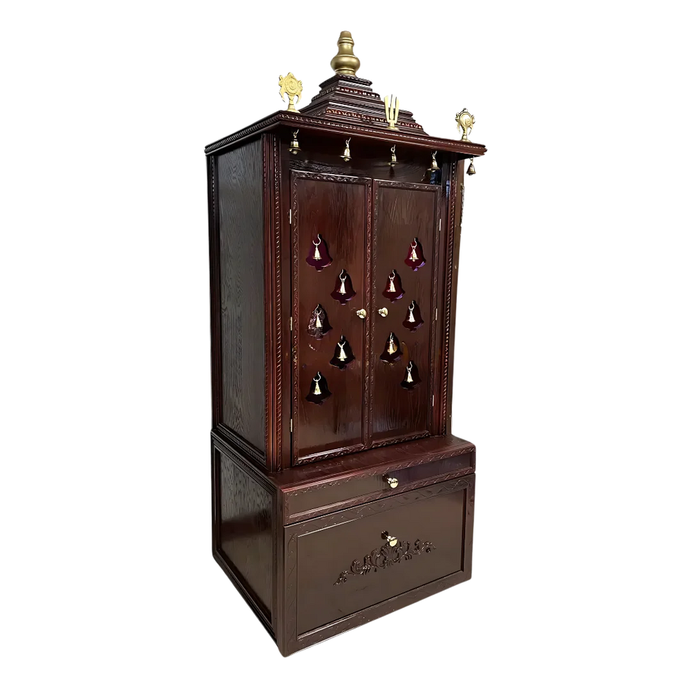 The Kalyaan Teak Wood Mandap in mahogany color is an elegant choice for those seeking a big mandir for home with a regal and traditional appearance. This vertically grand teakwood pooja mandap features a beautifully layered shikhara, spacious sanctum, and intricately designed bell-studded double doors that give it a rich devotional aura. The inner platform is stepped and can hold several idols and pooja can be arranged cleanly. This large size wooden temple is designed to hold regular rituals and festive arrangements. It has a sliding tray and deep drawer in its utility section at the bottom in order to keep necessary objects of pooja very neatly. The mahogany finish on the whole enhances the overall unit with a deeper and sound sense that can further make the brass accents and pooja lamps prominent visually. This pooja mandap is made up of quality craftsmanship and details which makes it perfect in homes looking to have a spiritual order but also style. From its towering crown to its functional base, every element is aligned for utility and grace. The polished mahogany color also helps the mandap blend into rich interior themes, elevating any dedicated pooja space.
