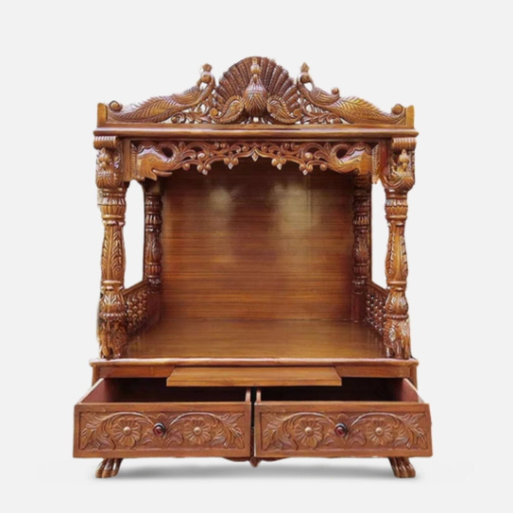 The Kamaljyot Teak Wood Mandir is a very beautiful wooden temple which demonstrates traditional design and religious beauty. It has carved designs on the pillars and the crown indicating good skill and devotion. The rich brown teak color gives a warm and elegant look that matches both modern and traditional homes. The spacious design makes it perfect for keeping idols and pooja items comfortably. The carved peacock designs and layered top add a royal touch to the temple. The broad base keeps the mandir strong and stable while adding to its beauty. Two large drawers at the bottom give space to store incense sticks, matchboxes, and other pooja things neatly. The solid structure is built to last long and stay strong for daily use. The natural wood grains on the surface add depth and make the mandir look rich and timeless in any home.