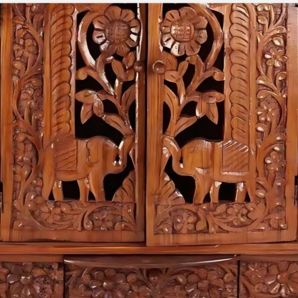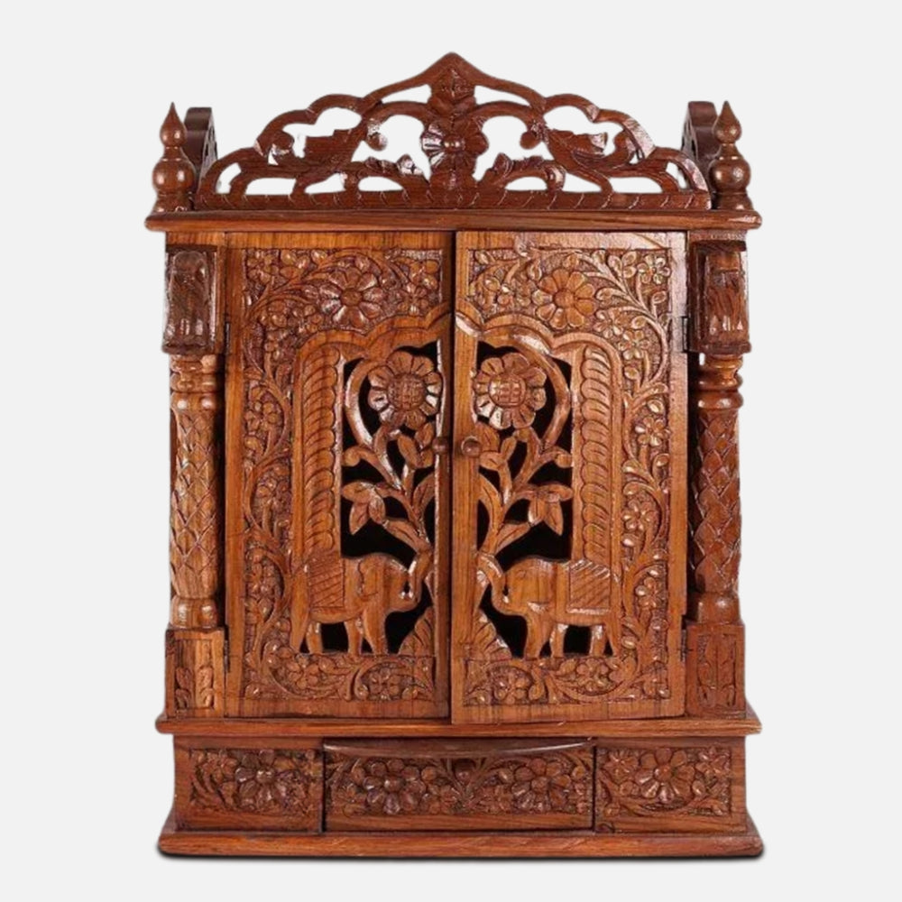 The two doors of this pooja mandir have beautiful carvings of elephants surrounded by fine floral and leaf designs. The elephants with raised trunks stand for strength, wisdom, and prosperity in Hindu belief. These carvings are not only for decoration but also have deep spiritual meaning. Behind the elephants, there is a soft jaali pattern that lets light pass and gives a rich look. The brass knobs are in line with the design and provide easiness in opening the doors. The teak polish provides the temple with a touch of ancient beauty. A combination of all these makes the mandir appear well balanced in terms of art, faith, and grace.
