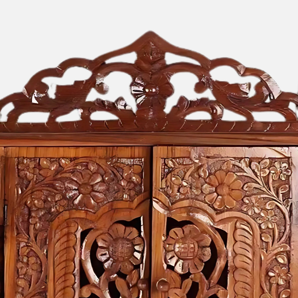 The top arch of this pooja mandir has fine hand-carved designs that give it a royal and graceful look. The floral and leaf patterns flow smoothly and match well with the carvings below. The open design keeps it light while still showing the grand style of a traditional temple. The mandir has a crown shaped arch on its top and represents safety and divinity. All these minor details are emphasized in the teak color polish and show the skills of the workmanship. This masterpiece turns the wooden mandir into something rich and special. Any house is beautified by turning it into a place of faith and beauty.