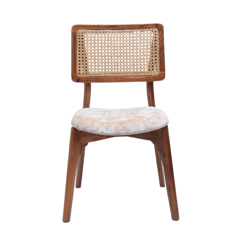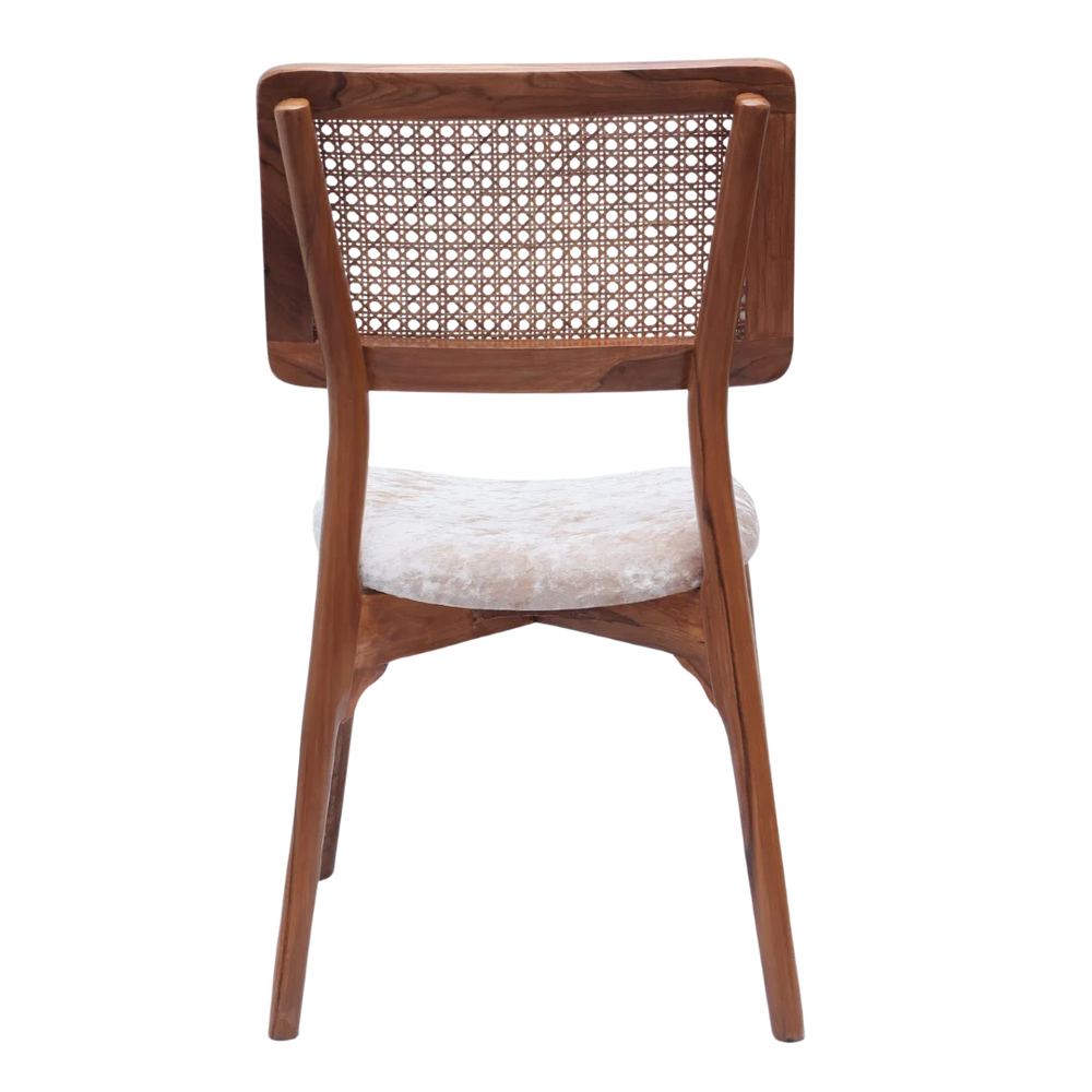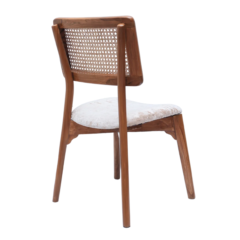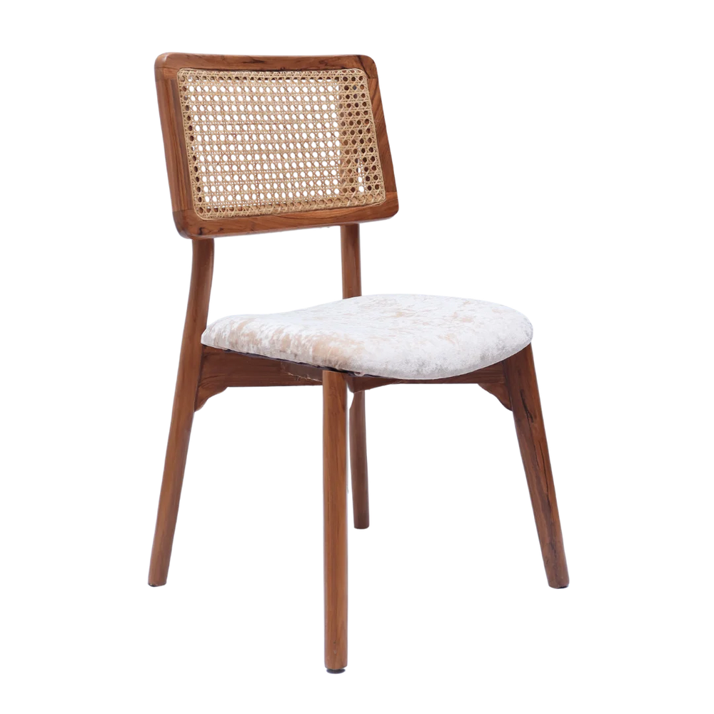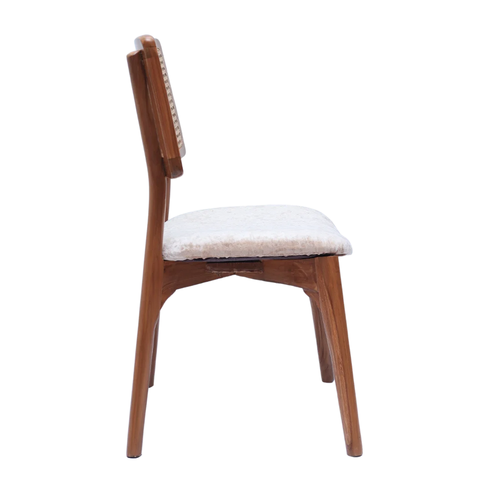 The Lattice Teak Wood Dining Chair is a nice mix of modern simple design and handmade tradition. It is made with a natural teak color wood frame. This cane dining chair has a wide and airy cane backrest with a soft cushioned seat. The teak color frame shows natural teak grains which give a rich and earthy look. The seat is covered with smooth gold color fabric that adds a touch of beauty to the clean design. The cane backrest gives good support and keeps the chair light and fresh. The compact but strong frame makes it good for daily meals and special gatherings. The teak color frame and gold color seat bring a warm and balanced look that fits well in modern and classic dining rooms. If you want a cane chair for dining table spaces or you want a stylish dining chair this chair fits nicely in any setup. The Lattice Dining Chair gives strong support and comfort with a beautiful modern design.