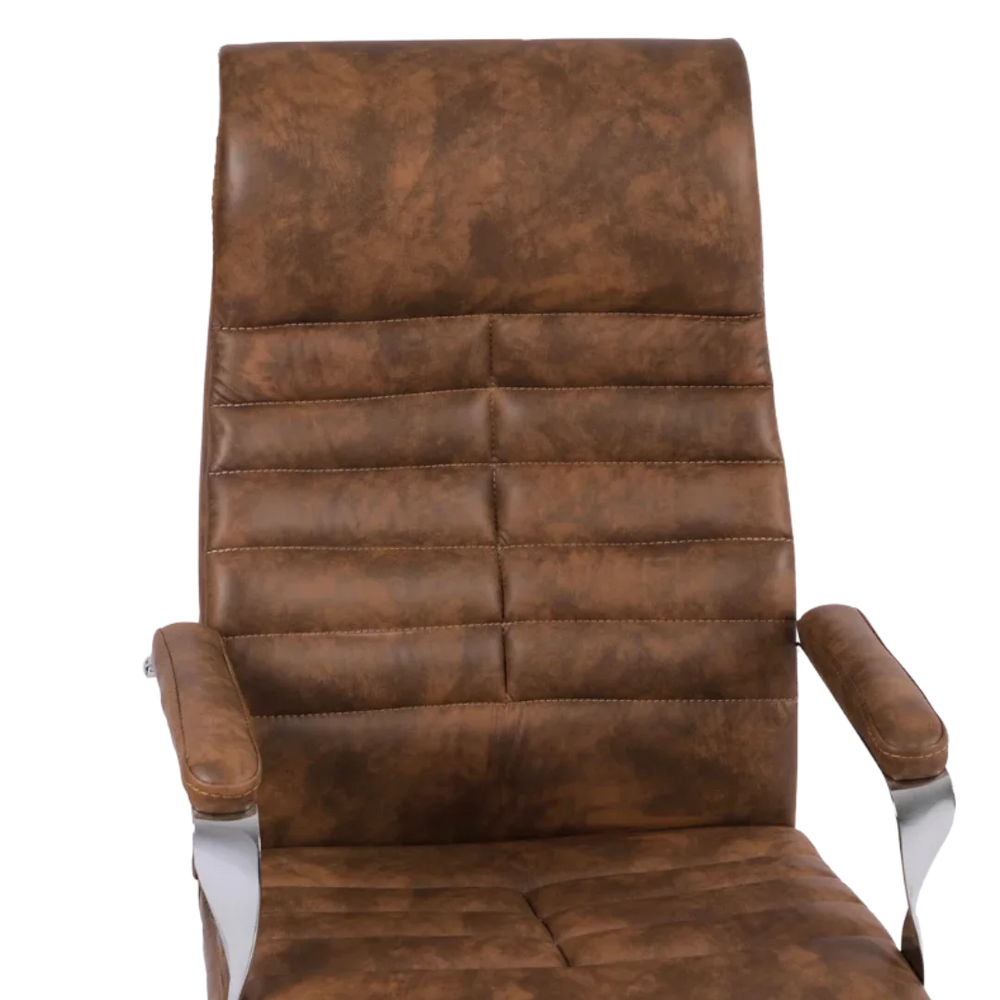 This office chair has a backrest with panel-style stitching that gives it a bold and stylish look. The layered design looks nice and also gives even support to your back. It fits the natural curve of your spine and helps you sit in a better way. The clean shape makes the chair look neat and formal, perfect for office use. The brown color cover matches well with executive office setups. The stitching makes the back of the chair stand out and look professional. This chair is made to give both comfort and a smart look, making it a good choice for director cabins or modern workspaces.