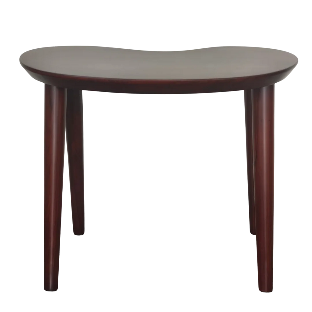 Teakwood table with kidney-shaped top, sleek legs, modern appeal.
