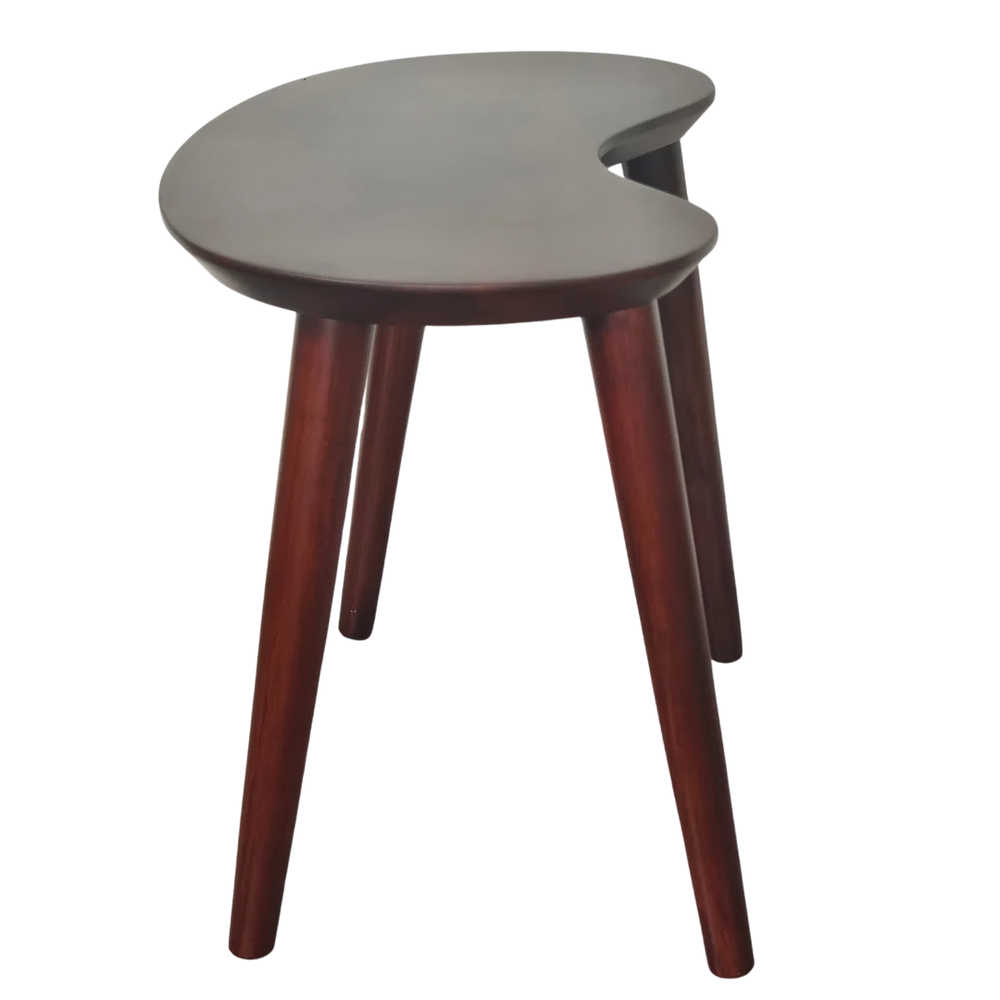 The Luna Teak Wood Coffee Table is a modern table with a special free-form top that gives a fresh look to your space. The curved shape of the top makes it look different and helps it fit well in corners or next to sofas. The flat surface is smooth and wide enough to keep cups or showpieces. This coffee table stands on four round tapered legs that give a classic touch to its style. The brown color top looks bold with the teak color legs. This table is a good choice for any living room as it gives both style and use. Its small size is good for tight spaces and the unique shape makes it stand out. The round edges are soft and safe so it is also good for homes with children. You can use it beside a sofa or by itself and it will add beauty to the room. The shape and finish together give the table charm from every side. The brown color and teak polish show the wood grain and make the table look warm and natural.