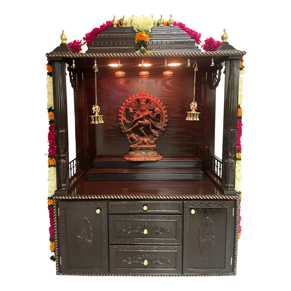 The Maheshwara pooja mandap in brown color showcases a refined architectural style that is both majestic and devotional. Designed as a big mandir for home, it combines traditional structure with expansive utility for daily rituals and festive worship. It has a layered dome top, a finely carved frame, and a wide worship base which makes it stand out in any prayer room. The dark shade of brown gives a deeper tone of sacredness and all the details that are carved are easily seen. Perfect for homes with bigger religious spaces, it is a great teakwood pooja mandap. The big idol stand is designed for big deities or rich pooja arrangements. Every section of this big size wooden temple is created to support organized rituals without losing elegance. The bottom layout provides wide drawers and side cabinets for storage, making this piece beautiful and functional. The brown color adds a rich traditional vibe, balancing aesthetics and poise. With its temple-like presence and intricate woodwork, this mandap becomes a true centerpiece for any spiritual corner in your home.