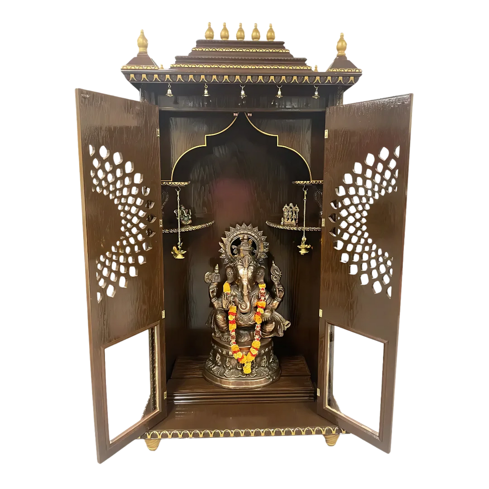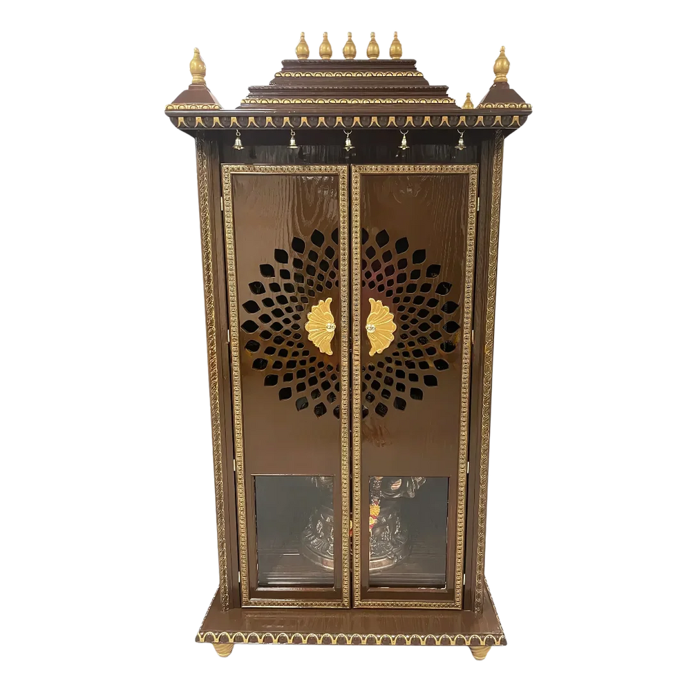 Mahima Teak Wood Mandap With Door in Brown Gold Color is a finely crafted big size wooden temple designed to give your pooja space a rich and peaceful look. The structure includes tall carved doors with eye-catching cut patterns, giving it a complete and traditional temple feel. Inside, the space is open and designed for placing large idols, pooja thali, and lamps comfortably. The dome-like top is styled with decorative finials and golden touches that enhance the spiritual appearance. The smooth base is strong and wide enough to hold sacred items during daily use. The brown gold color gives it a warm and royal shine, blending easily with all home interiors. The design includes detailed borders, curved corners, and fine finish which shows expert craftsmanship. The golden borders on the base and top match the door handles and add to the beauty. This pooja mandap offers a calm and rich atmosphere for everyday rituals. It fits well in both modern and traditional homes. The brown gold color and strong body make this mandap a lasting and graceful part of your spiritual setup.