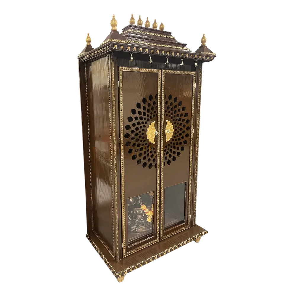 This mandap has two tall doors with floral cut patterns that give a temple-like feel. These doors open wide and offer full access to the pooja area. The handles are placed at a good height and have a gold finish that adds beauty. The carved patterns on the door give a layered look. The bottom panel has clear sections that offer a partial view even when closed. This combination keeps the space private yet connected. The doors swing smoothly and stay in place after opening. Their design helps keep dust out. The doors also enhance safety for kids and pets.